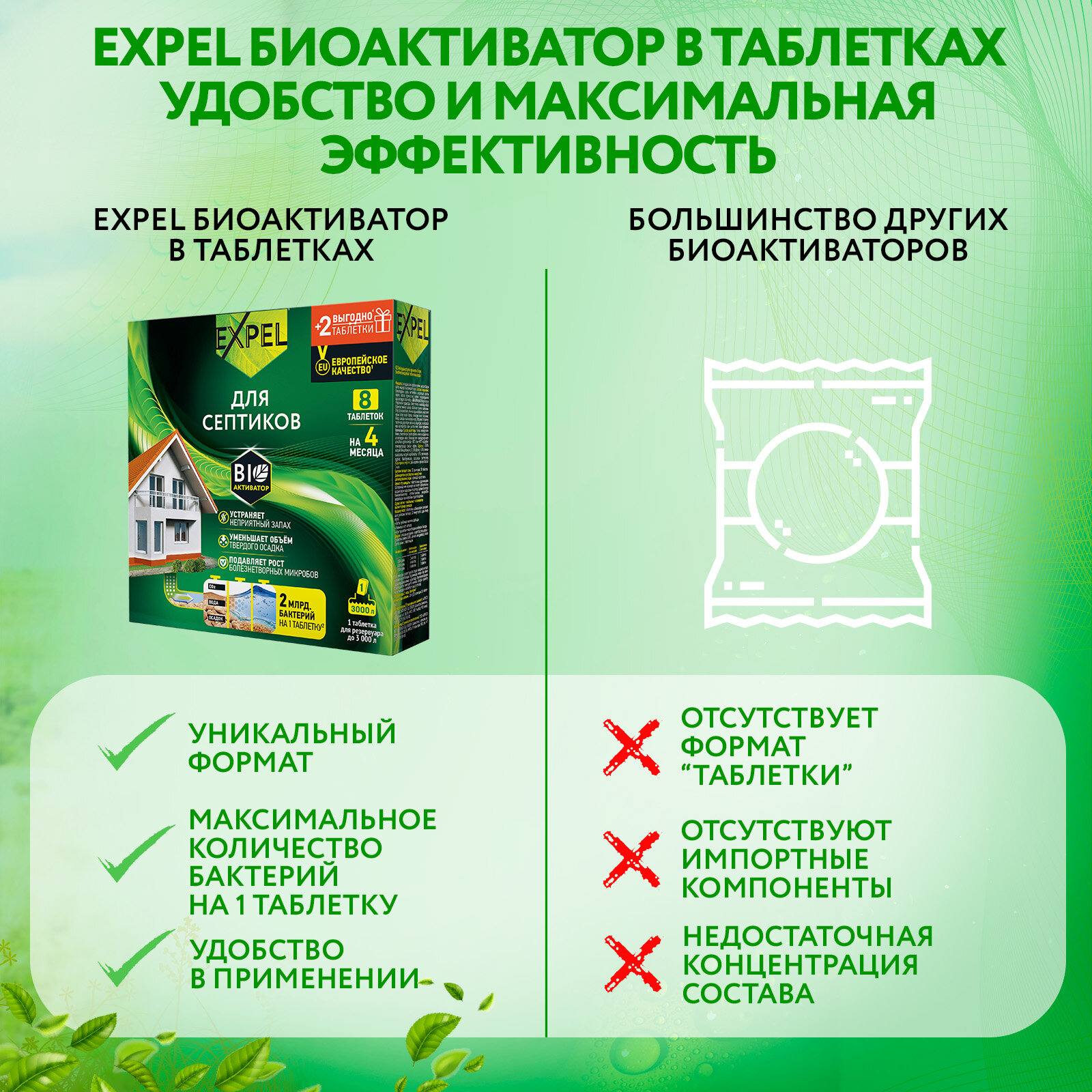 Биоактиватор для септиков и выгребных ям, Бактерии, средство для дачного туалета Expel, 10 таблеток