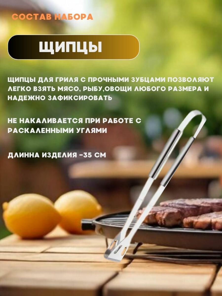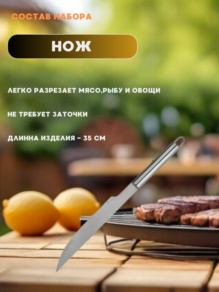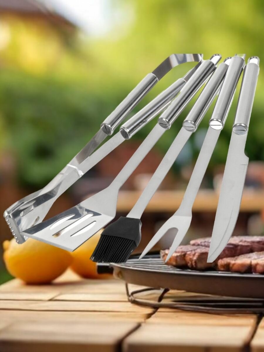 | Длина | вилка для мяса 35 см, кисточка 36 см, лопатка 36 см, нож для мяса 30 см |