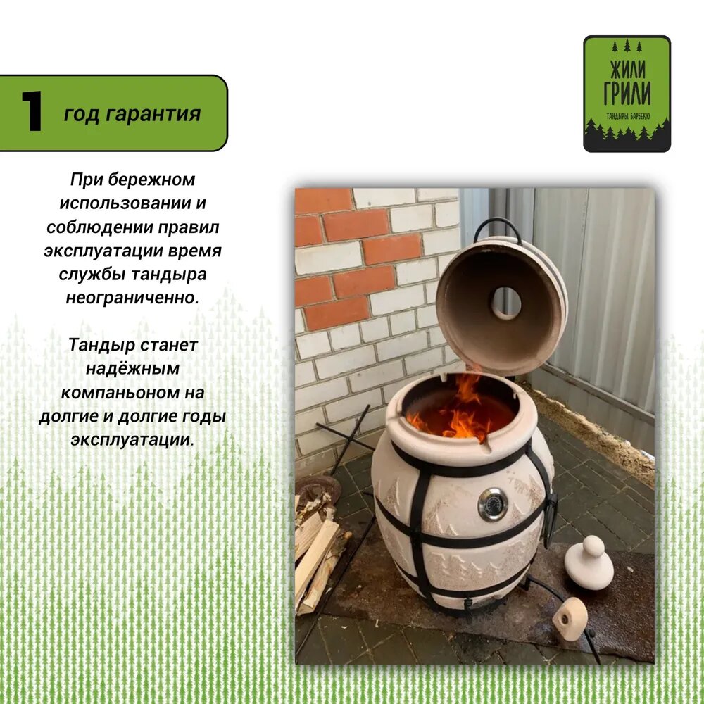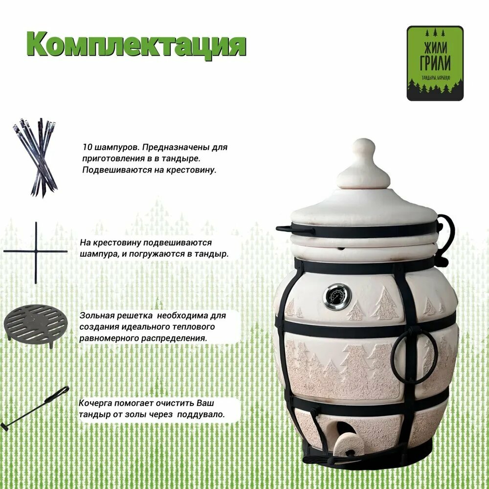 | Дополнительная информация | 8 шампуров; колосник; крестовина для подвешивания шампуров; откидная крышка; термометр в крышке тандыра |