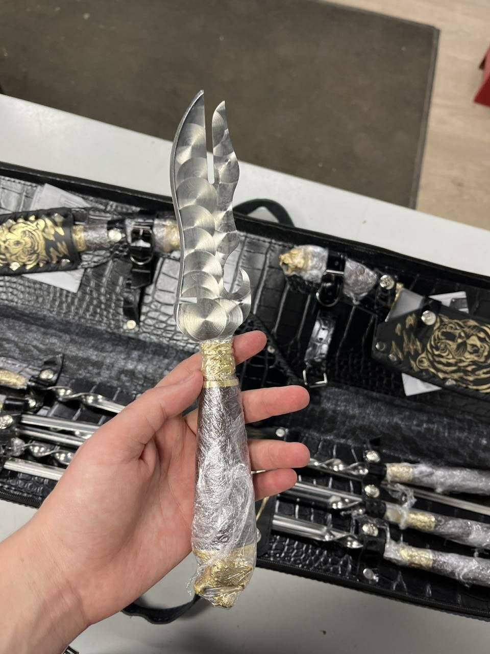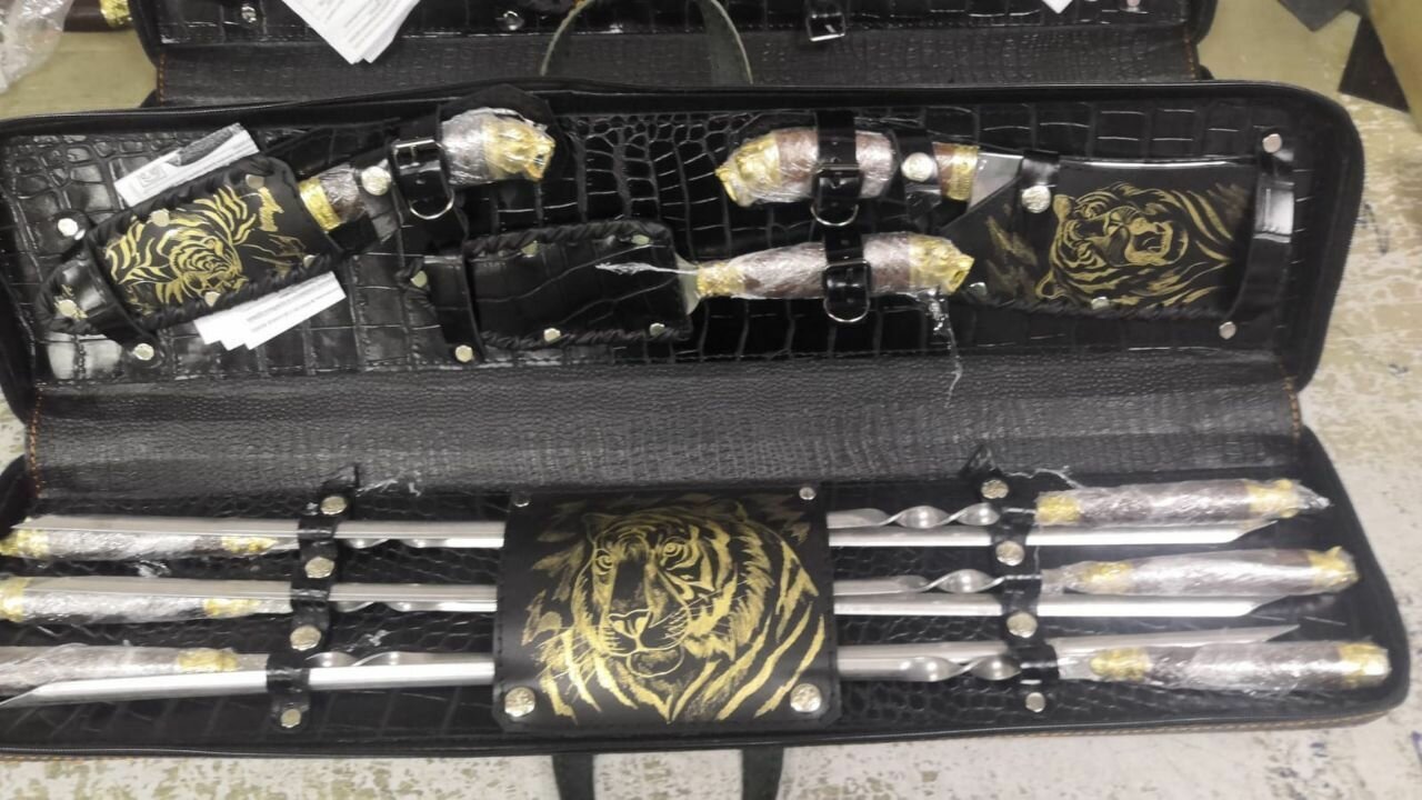 | Комплектация | Красивый кожаный чехол-кейс с удобной ручкой для транспортировки; 6 шампуров «Лесная сказка» с художественным литьем латунь; Нож Охотничий с художественным литьем латунь; Тяпка с художественным литьем латунь; Вилка для снятия мяса с художественным литьем латунь. |