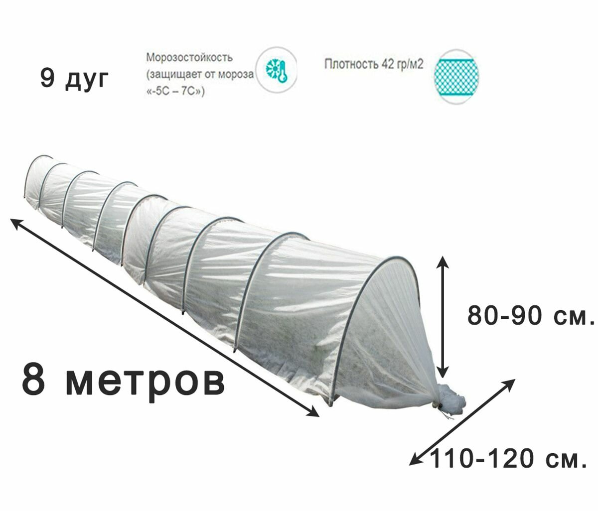 | Дополнительная информация | в комплекте: дуги ПНД 5 шт, колышки (длина 25 см) 11 шт, клипсы (диаметр 20 мм) 11 шт, укрывной материал «СУФ-42» 1 шт |