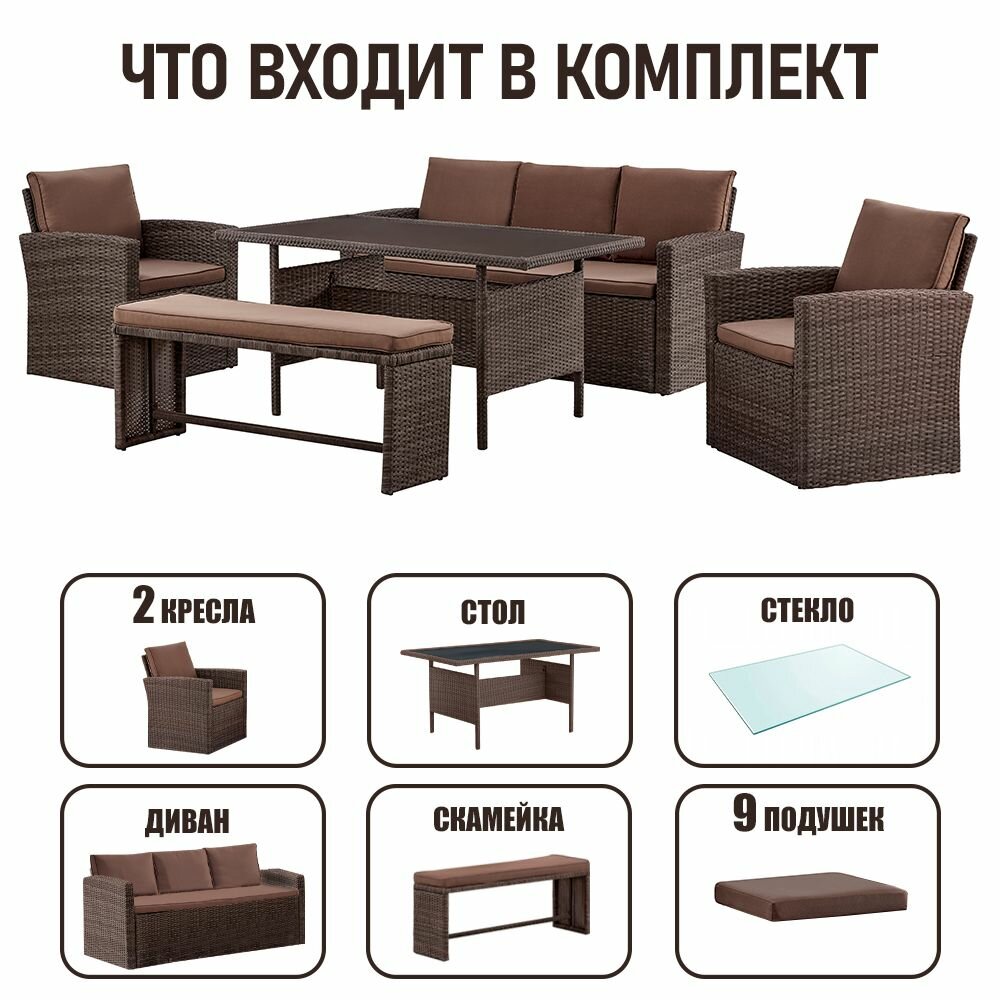 | Комплектация | Трёхместный диван с подушками на сиденье и под спину; Два кресла с подушками на сиденье и под спину; Обеденный стол с закалённым стеклом 5мм; Скамейка с подушкой. Набор садовой мебели |