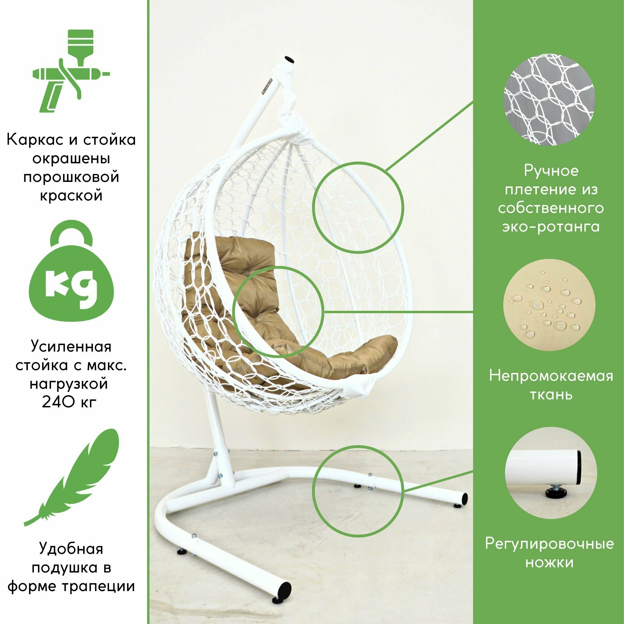 Подвесное кресло садовое кресло кокон для отдыха дома Mollis Ажур 240 кг EcoKokon одноместное с усиленной стойкой Белый с бежевой подушкой трапеция