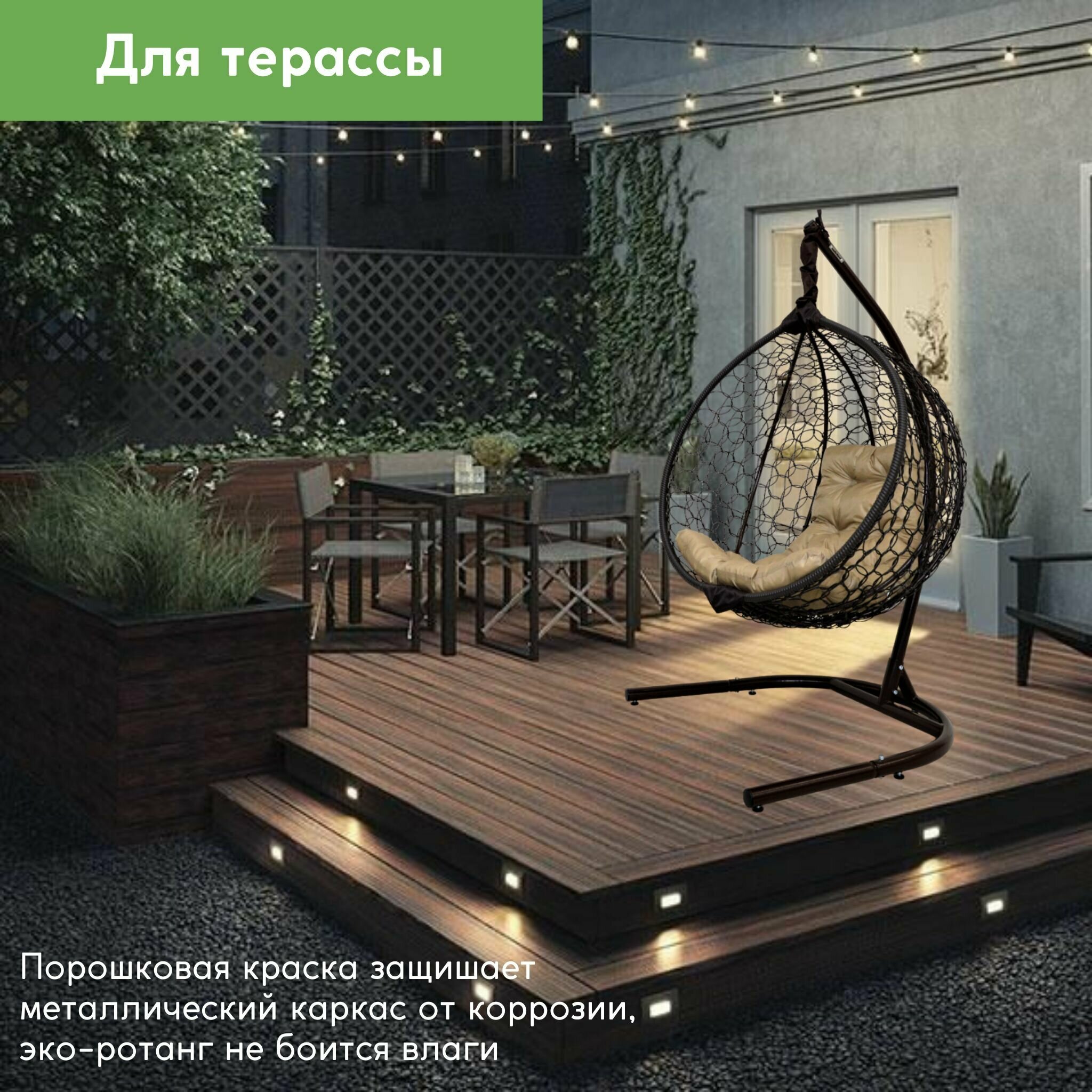 Подвесное кресло садовое кресло кокон Mollis Ажур 240 кг EcoKokon одноместное с усиленной стойкой Коричневый с бежевой подушкой трапеция