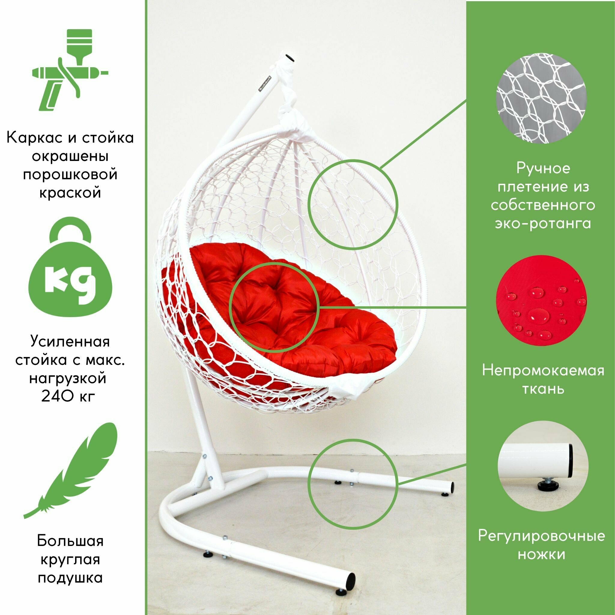 Подвесное кресло садовое кресло кокон для отдыха дома Mollis Ажур 240 кг EcoKokon одноместное с усиленной стойкой Белый с красной круглой подушкой