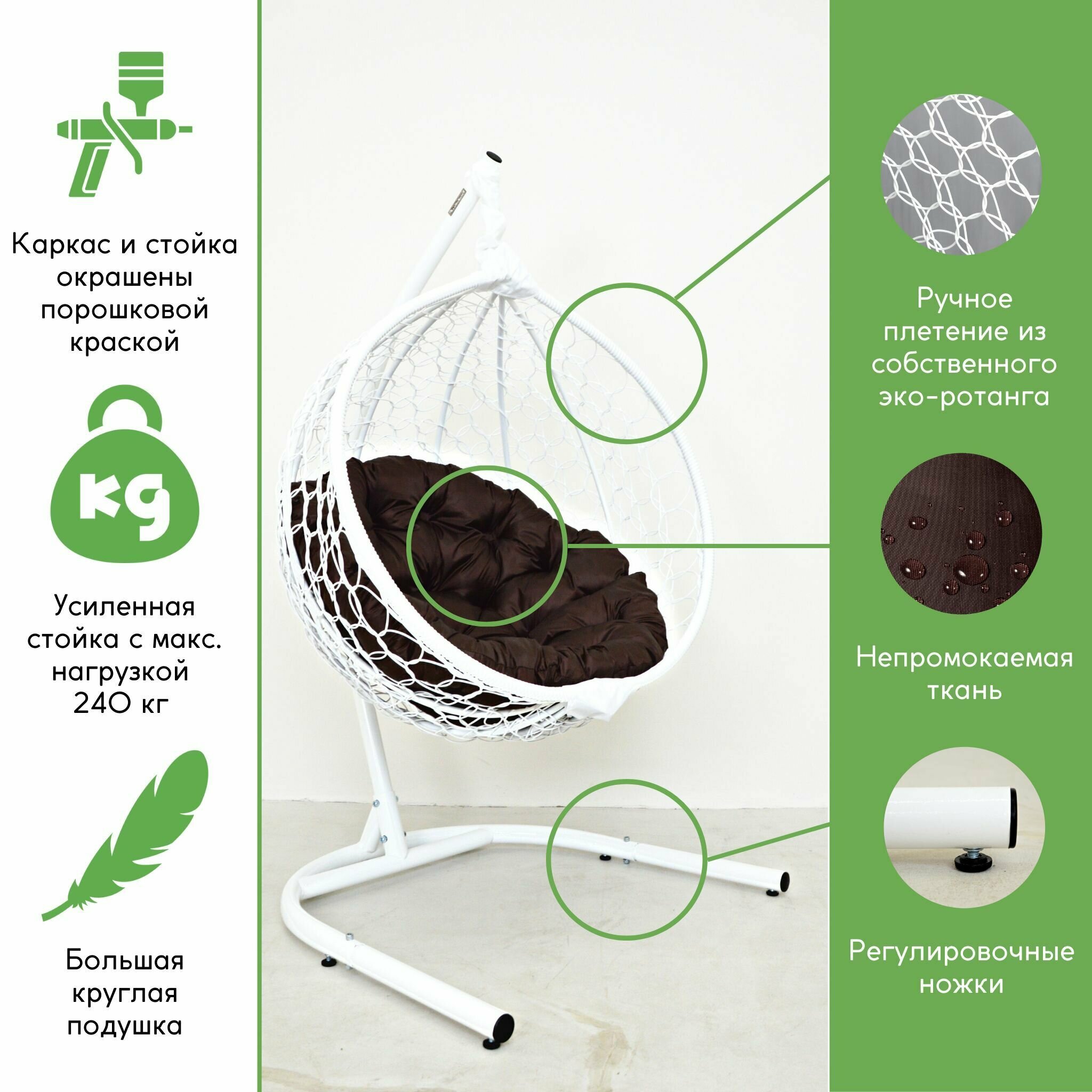 Подвесное кресло садовое кресло кокон для отдыха дома Mollis Ажур 240 кг EcoKokon одноместное с усиленной стойкой Белый с зеленой круглой подушкой