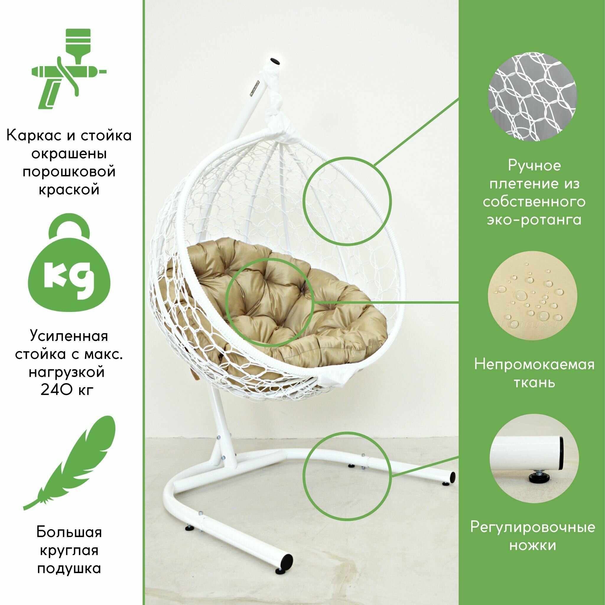 Подвесное кресло садовое кресло кокон для отдыха дома Mollis Ажур 240 кг EcoKokon одноместное с усиленной стойкой Белый с зеленой подушкой трапеция