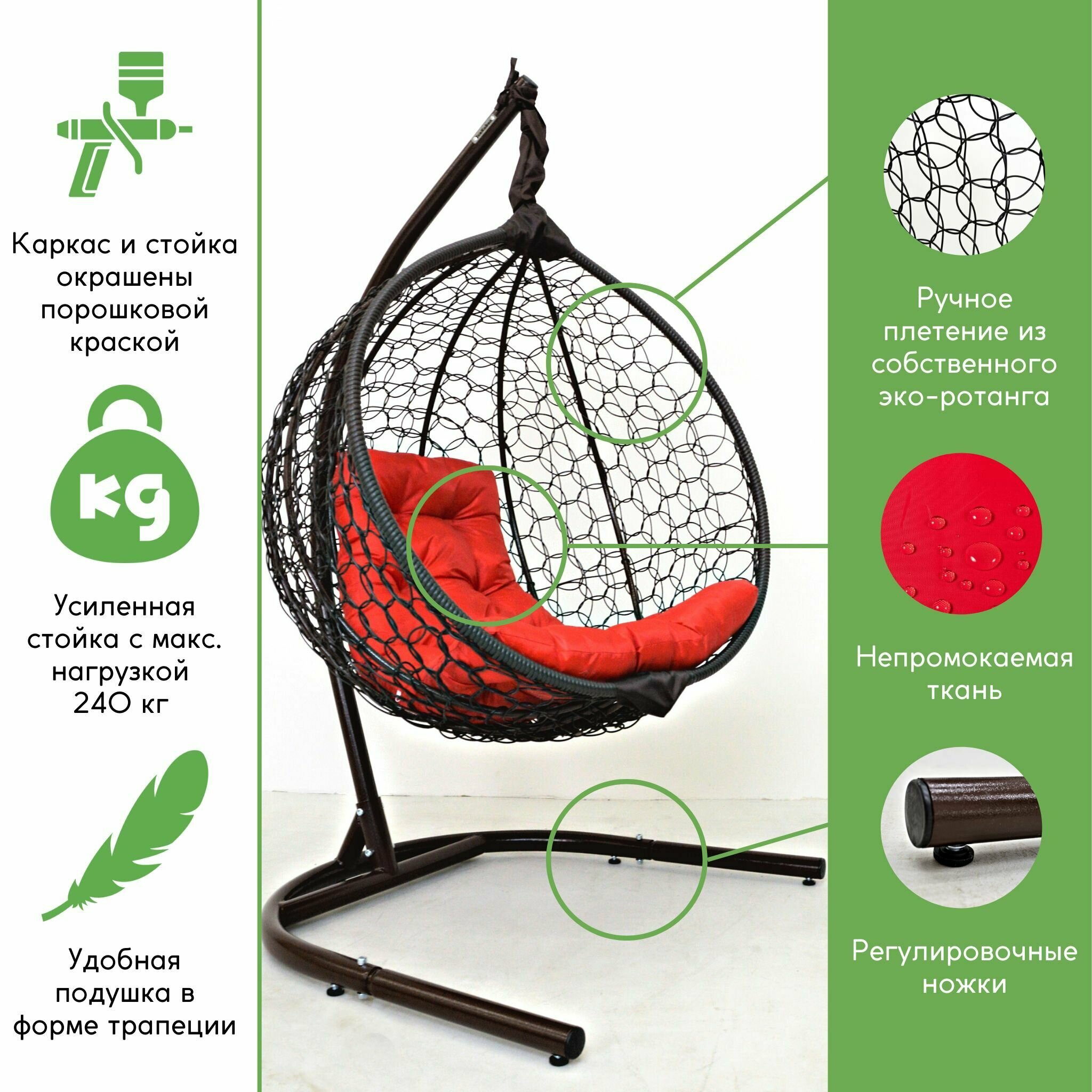 Подвесное кресло садовое кресло кокон Mollis Ажур 240 кг EcoKokon одноместное с усиленной стойкой Коричневый с красной подушкой трапеция