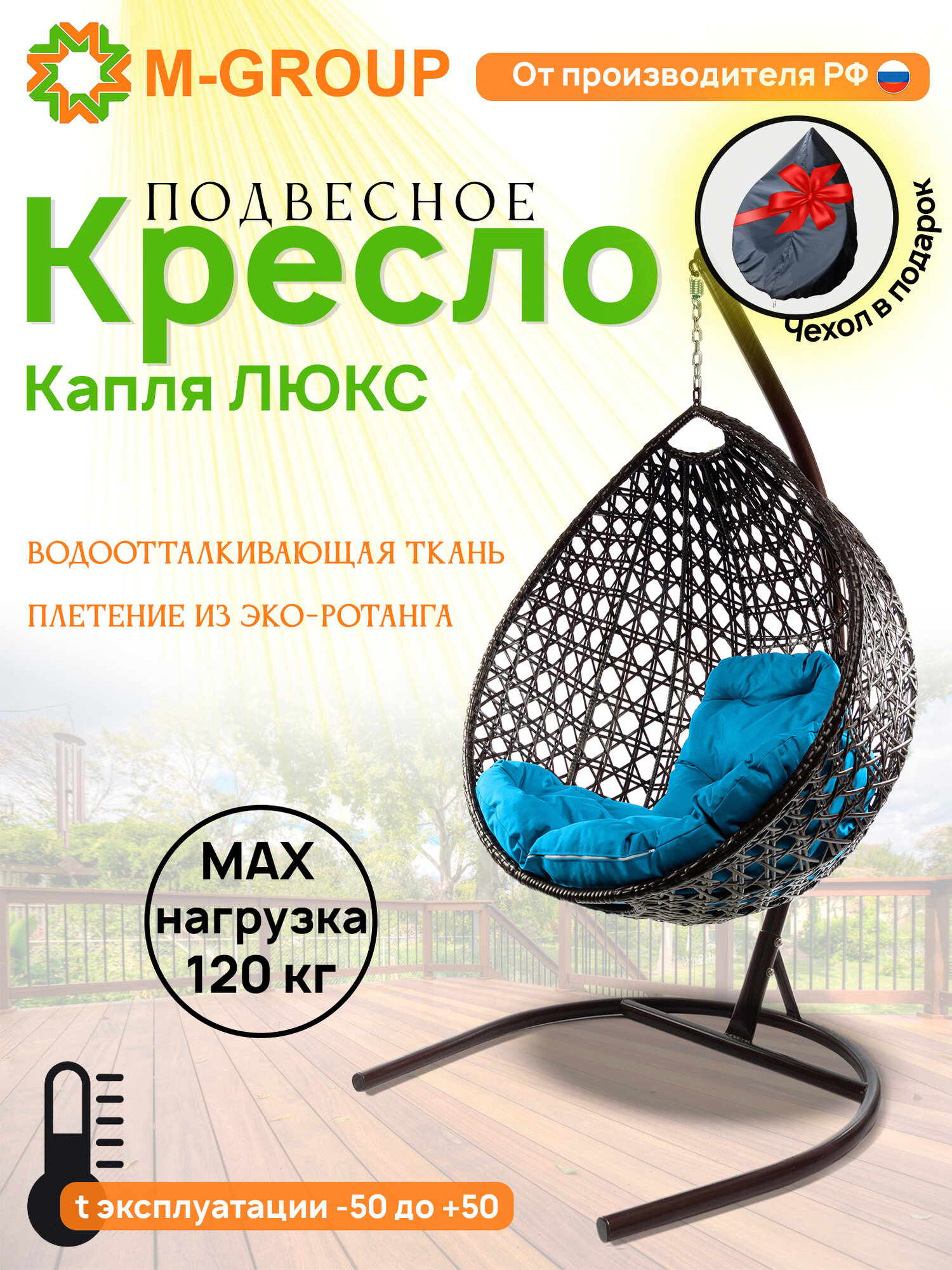 Купить Подвесное кресло M-group капля люкс с ротангом коричневое голубая подушка