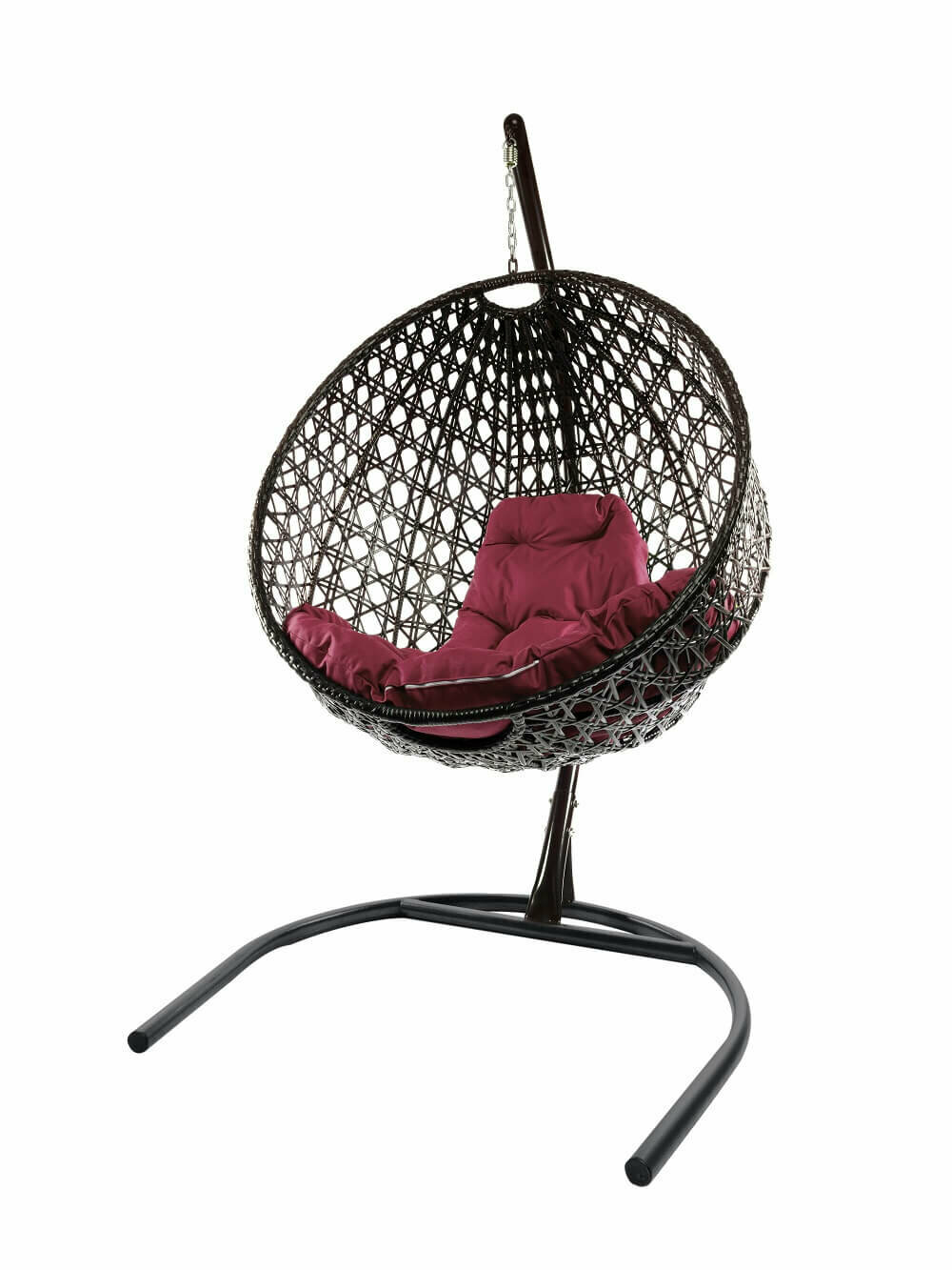 Подвесное кресло из ротанга "круг люкс" с ротангом коричневое, бордовая подушка