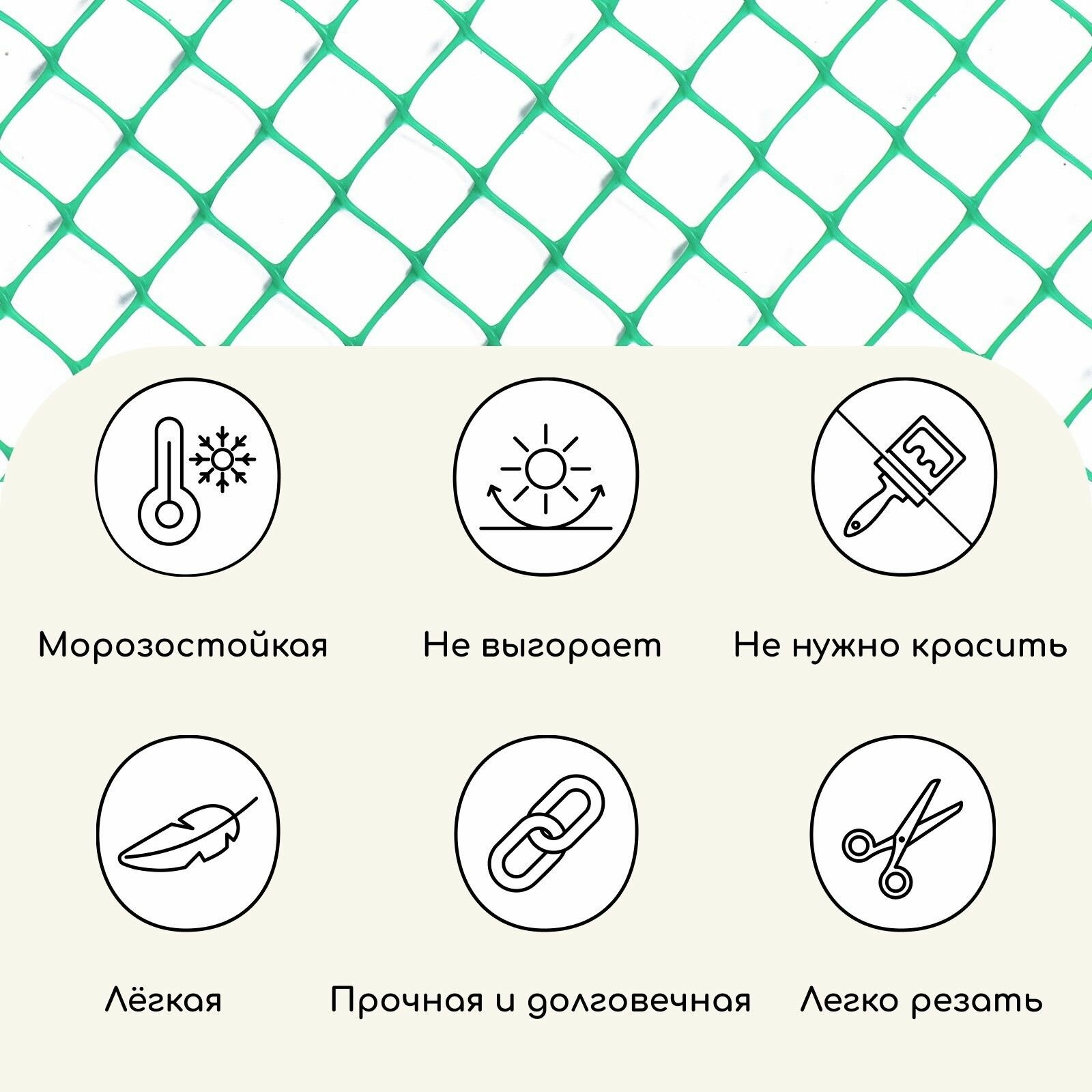 | Дополнительная информация | Сетка садовая пластиковая c квадратной ячейкой Предназначена для применения в быту при устройстве заборов, ограждений, беседок, в качестве опоры для вьющихся растений, при изготовлении клеток для мелких животных Простота применения и монтажа Малый вес Высокая прочность Многоразовое использование Не требует покраски Долговечность: не разрушается под воздействием солнца и воды Экологичность: не образуются ржавчина, грибок и гниль |