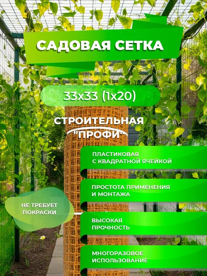 | Дополнительная информация | Сетка садовая пластиковая c квадратной ячейкой Предназначена для применения в быту при устройстве заборов, ограждений, беседок, в качестве опоры для вьющихся растений, при изготовлении клеток для мелких животных Простота применения и монтажа Малый вес Высокая прочность Многоразовое использование Не требует покраски Долговечность: не разрушается под воздействием солнца и воды Экологичность: не образуются ржавчина, грибок и гниль |