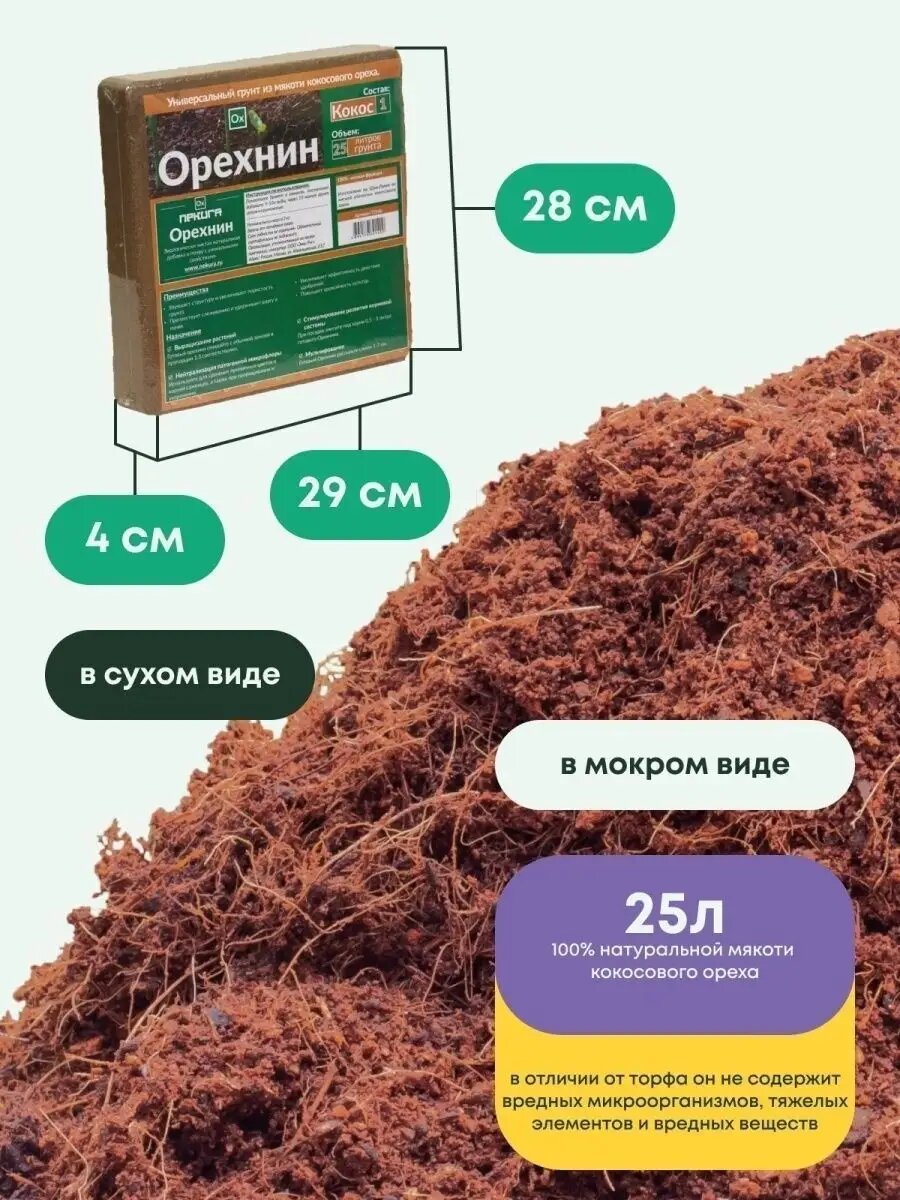 Кокосовый субстрат, кокосовый грунт, Орехнин-1, Обьем 25 л