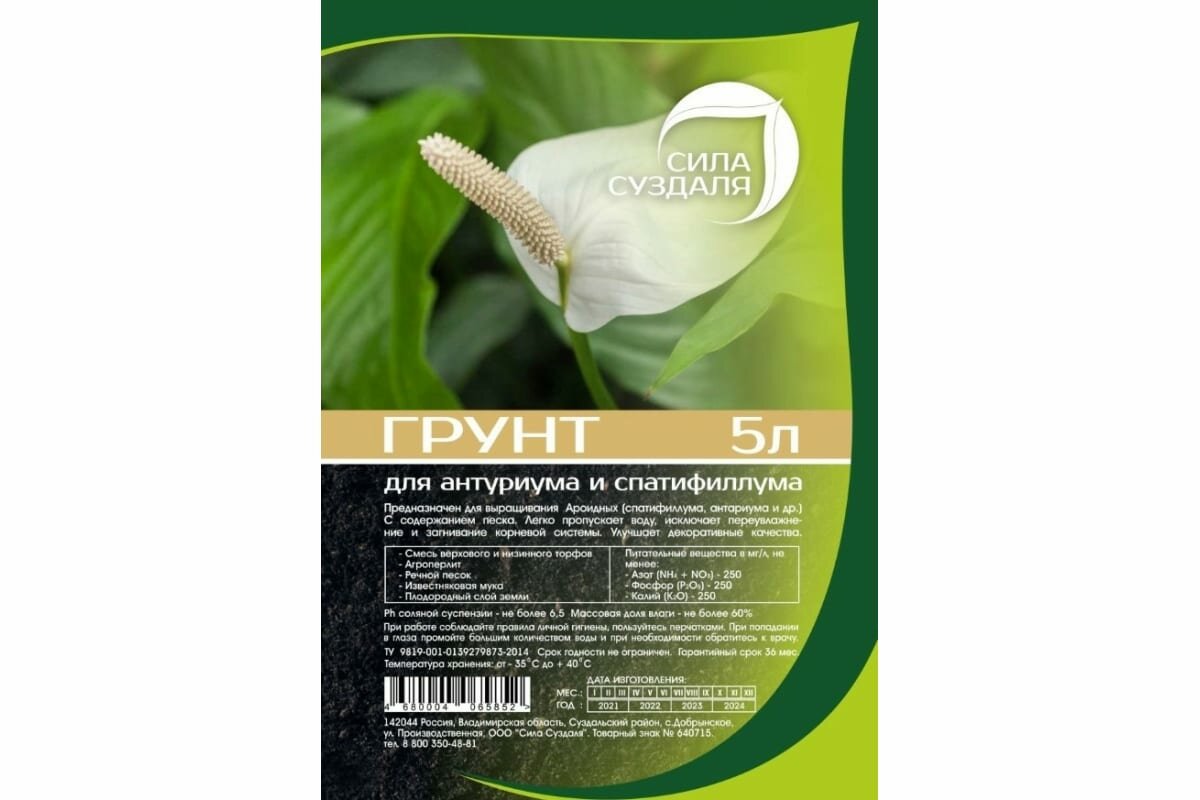 | Состав | Грунт для замиокулькаса, антуриума и спатифиллума, ароидных 5 л Сила Суздаля |