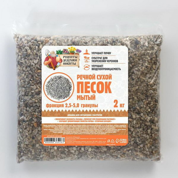 Речной песок "Рецепты дедушки Никиты", сухой, фр 2,5-5,0, гранулы, 2 кг