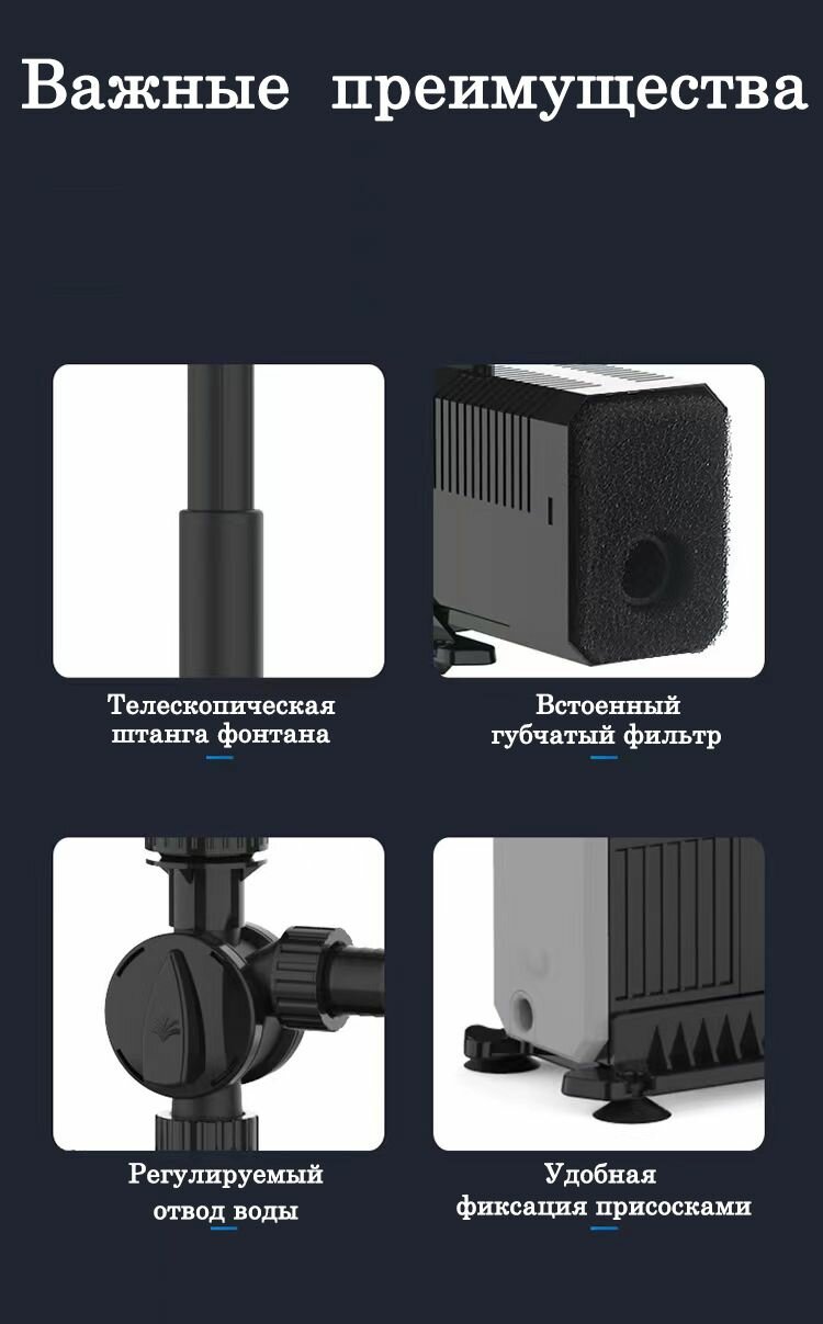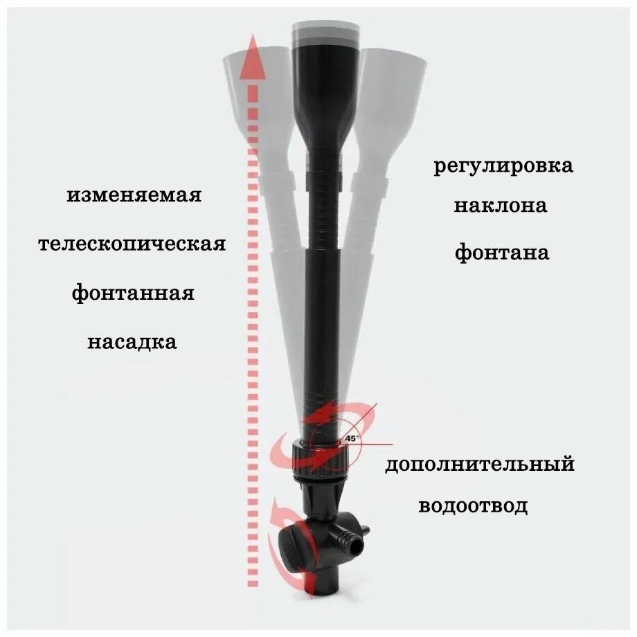 | Комплектация | 3 сменные фонтанные насадки, отвод с регулятором, фильтрующая губка, насос, переходник на евровилку |