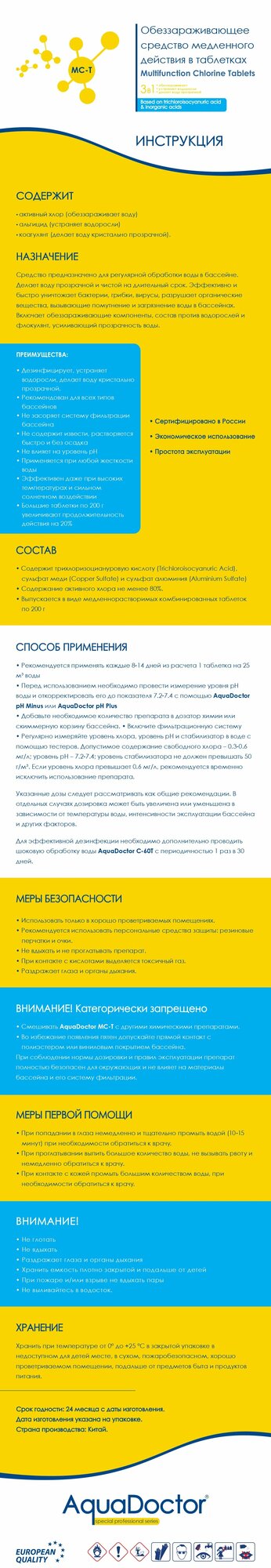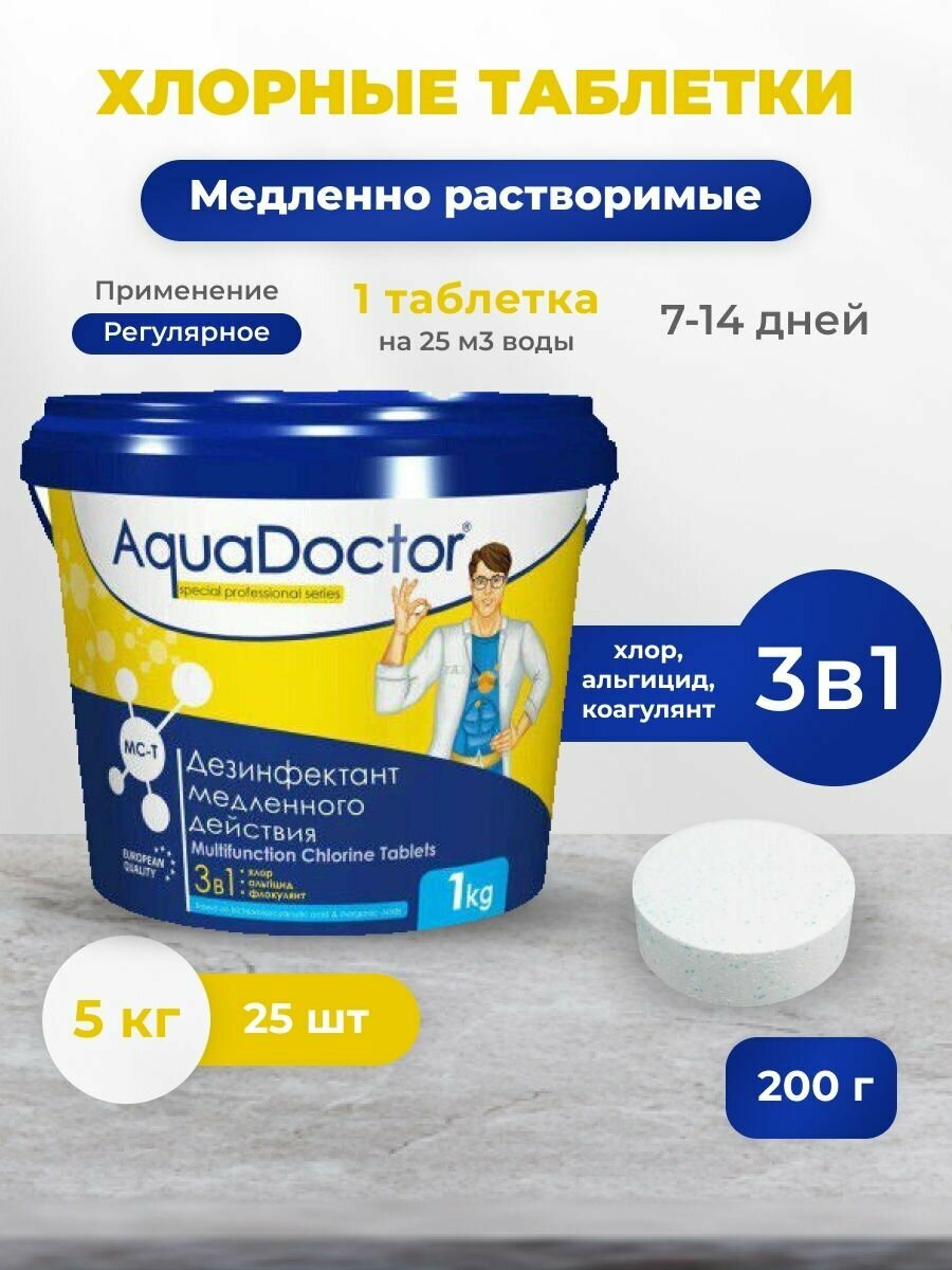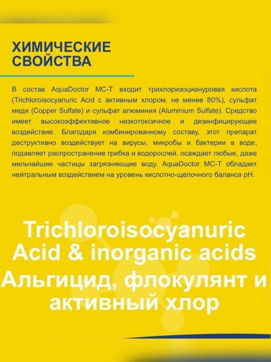 СохранитьДезинфектант 3 в 1 AquaDoctor MC-T 5 кг, в табл.200гр. медленнорастворимые хлорные таблетки для бассейна по 200 гр. интересное: