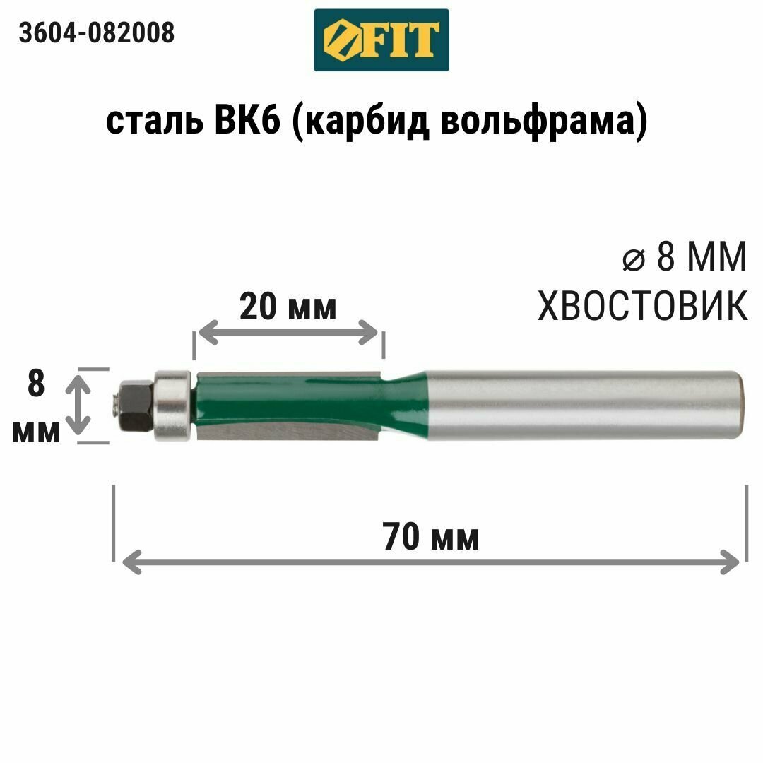 Купить Фреза для выборки заподлицо с нижним подшипником (8х20х70 мм) FIT 3604-082008