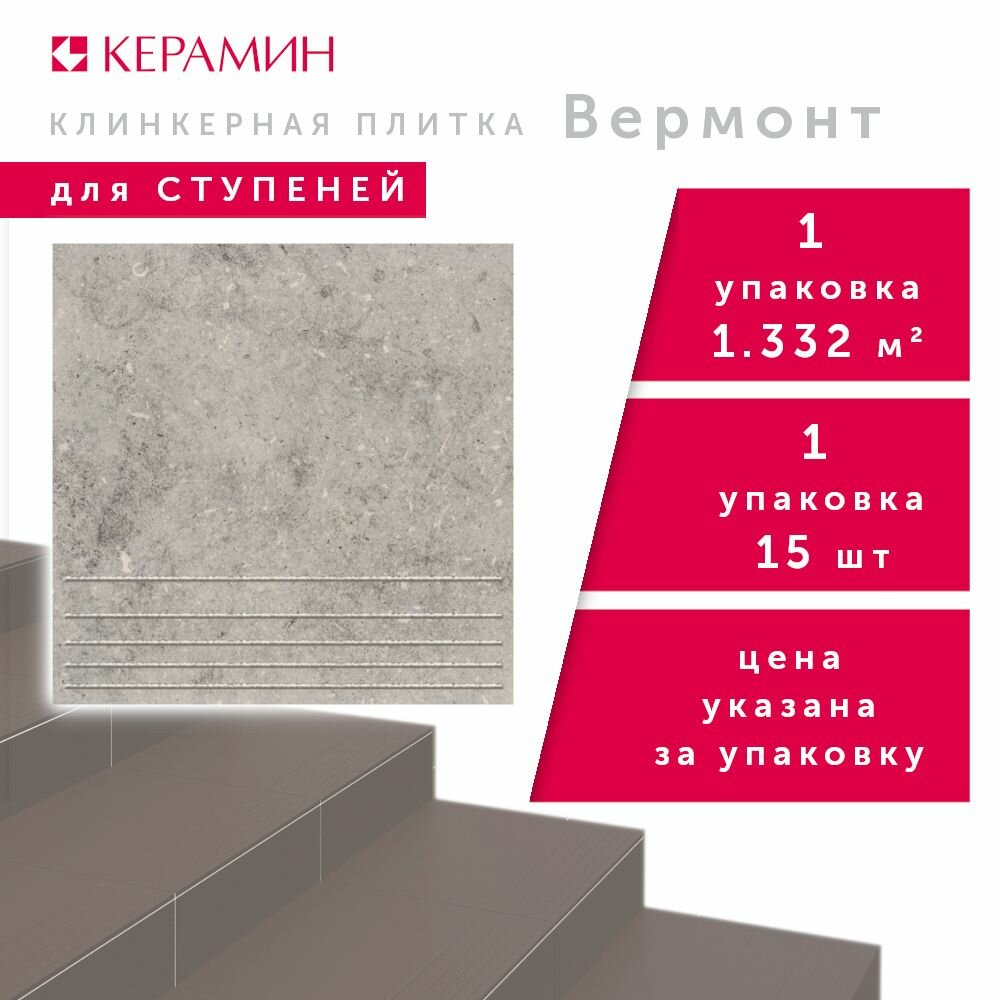 Купить Керамин ступень Клинкерная плитка Вермонт 2 серый 29,8х29,8