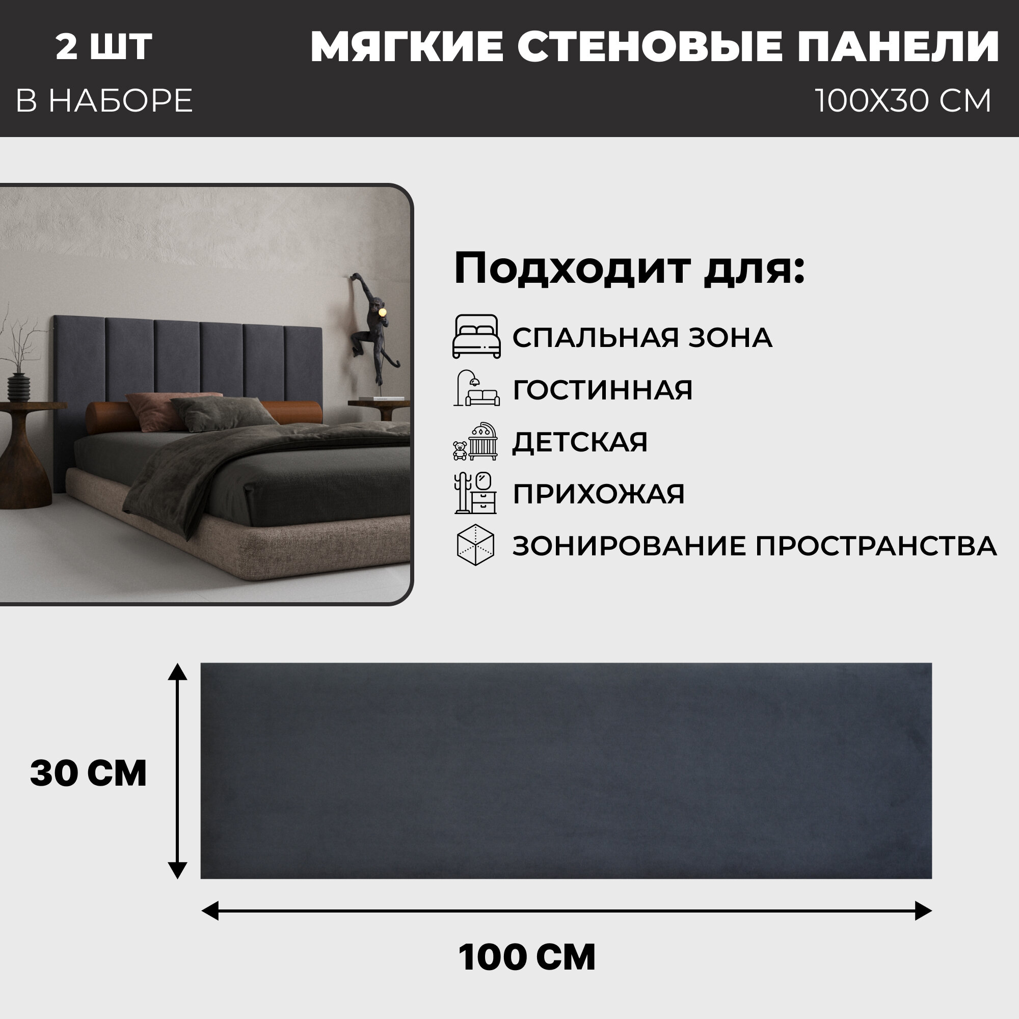 Мягкие стеновые панели, изголовье для кровати 100х30 см, комплект 2 шт, цвет серый графит