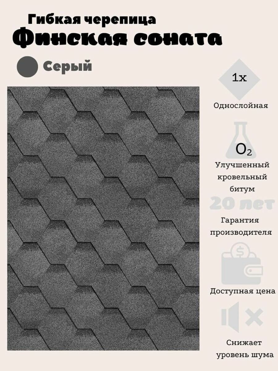 Гибкая черепица Shinglas оптима Соната, серый (3м2/уп) для крыши, многослойная