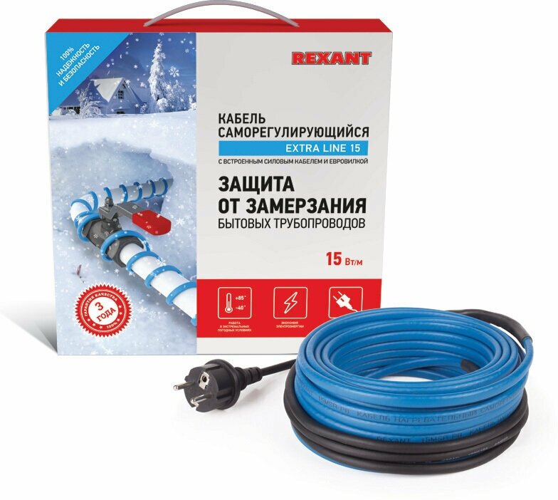 Комплект греющего кабеля REXANT 15 Вт/м с евровилкой для быстрой установки на трубу, 220 В, 15 м