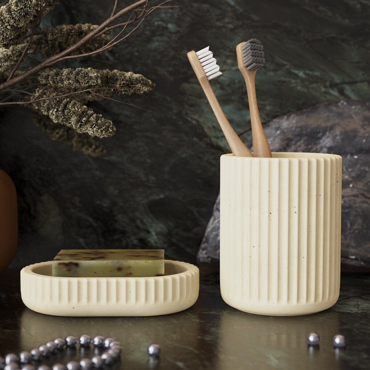 Набор для ванной комнаты Chloe 05 (мыльница для ванной и стакан для зубных щеток), бетон, кремовый глянцевый