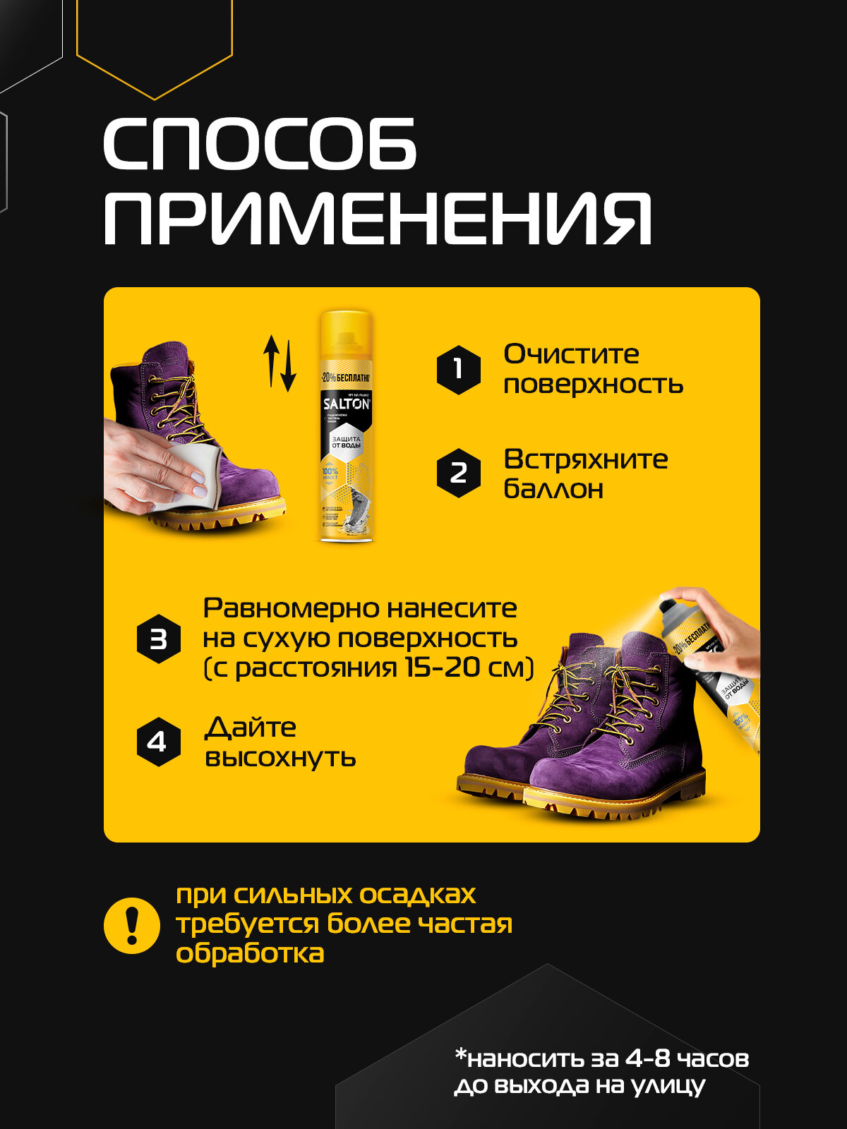 | Дополнительная информация | очистить поверхность, встряхнуть баллон, равномерно нанести на сухую поверхность (с расстояния 15-20 см), дать высохнуть, при сильных осадках требуется более частая обработка обуви; наносить за 4-8 часов до выхода на улицу. |