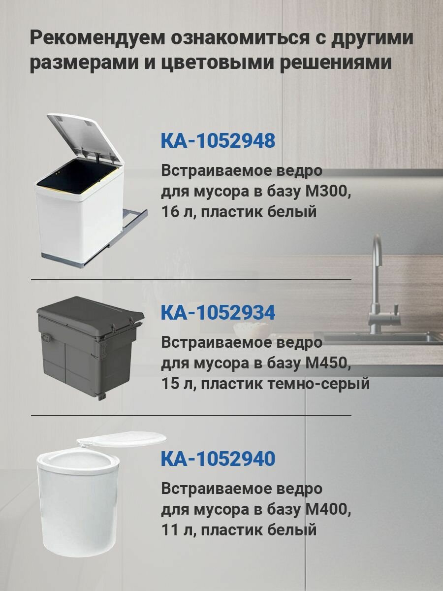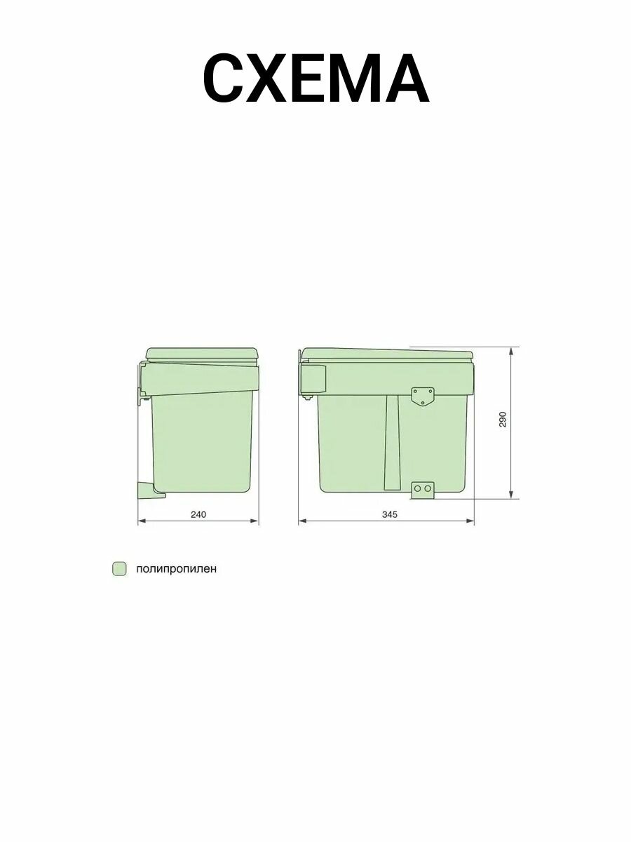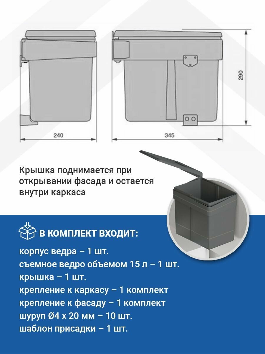 | Комплектация | корпус ведра (1 шт.), съемное ведро объемом 15 л (1 шт.), крышка (1 шт.), крепление к каркасу (1 комплект.), крепление к фасаду (1 комплект.)., шуруп Ø4 x 20 мм (10 шт.), шаблон присадки (1 шт.) |