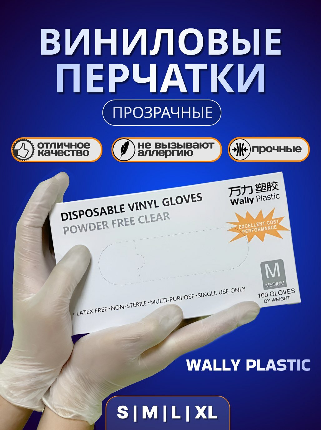 Перчатки виниловые Wally Plastic, прозрачные, размер М, 100 шт