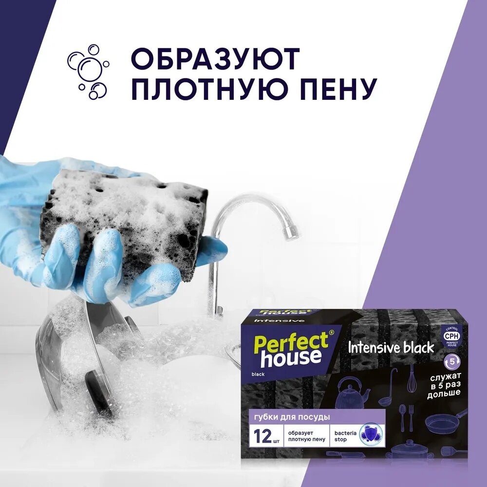 Губки для мытья посуды Perfect House Intensive black черные, хозяйственные для уборки на кухне, 12 шт