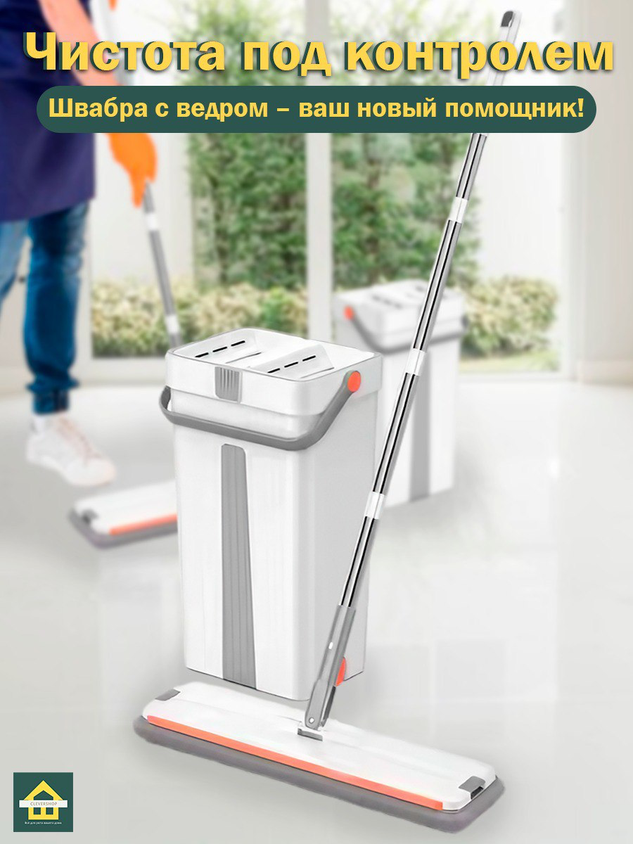 Купить Швабра CleverShop с ведром с отжимом и двумя сменными насадками для всех типов покрытия