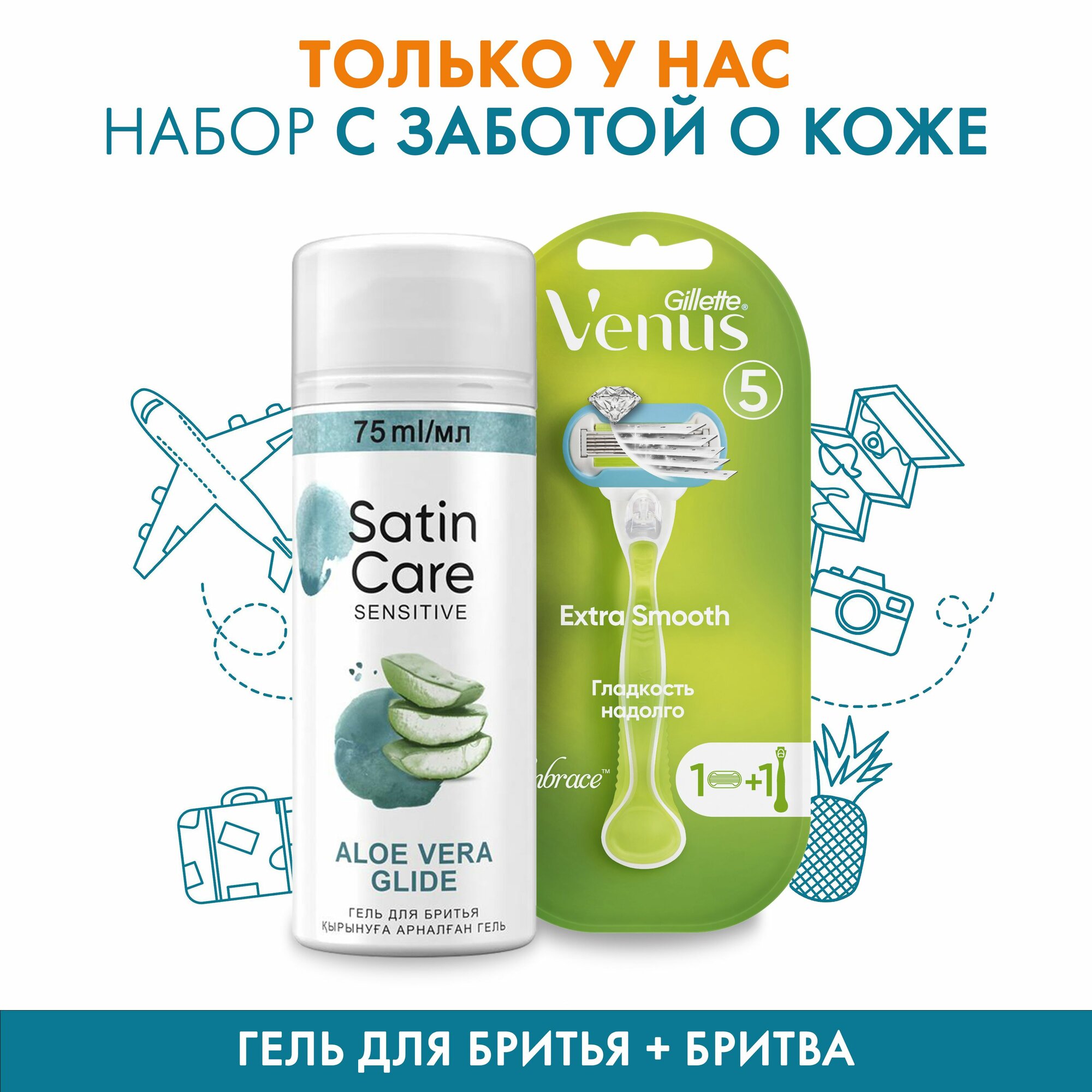 Купить Женская бритва Gillette Venus Extra Smooth Embrace + 2 кассеты+Гель для бритья Satin Care для чувствительной кожи Aloe Vera, 75 мл