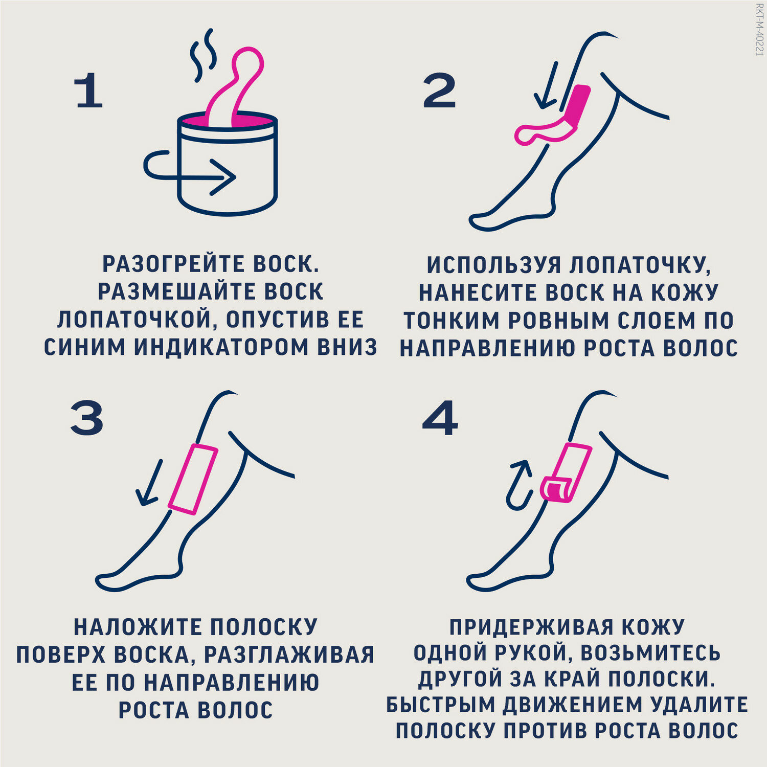1.Как разогреть воск? Определите подходящий для себя метод разогрева воска: микроволновая печь или водяная баня. Разогрейте воск согласно инструкции. Размешайте разогретый воск при помощи лопаточки, опустив её в баночку синим квадратом вниз. Помешайте воск от центра баночки к ее краям в течение минуты. 2.Как наносить воск? Используя лопаточку, нанести воск на кожу тонким ровным слоем по направлению роста волос. Сразу наложите полоску поверх воска, разглаживая ее по направлению роста волос. 3.Как удалять воск? Придерживая кожу одной рукой, другой рукой возьмите за край полоски. Быстрым движением удалите полоску против роста волос. Удаляя полоску, держите ее параллельно и как можно ближе к коже. Одна полоска может быть использована несколько раз подряд. Однако не рекомендуется использовать воск дважды на одном участке кожи в течение одной процедуры. Если на коже остался воск, промойте ее теплой водой
