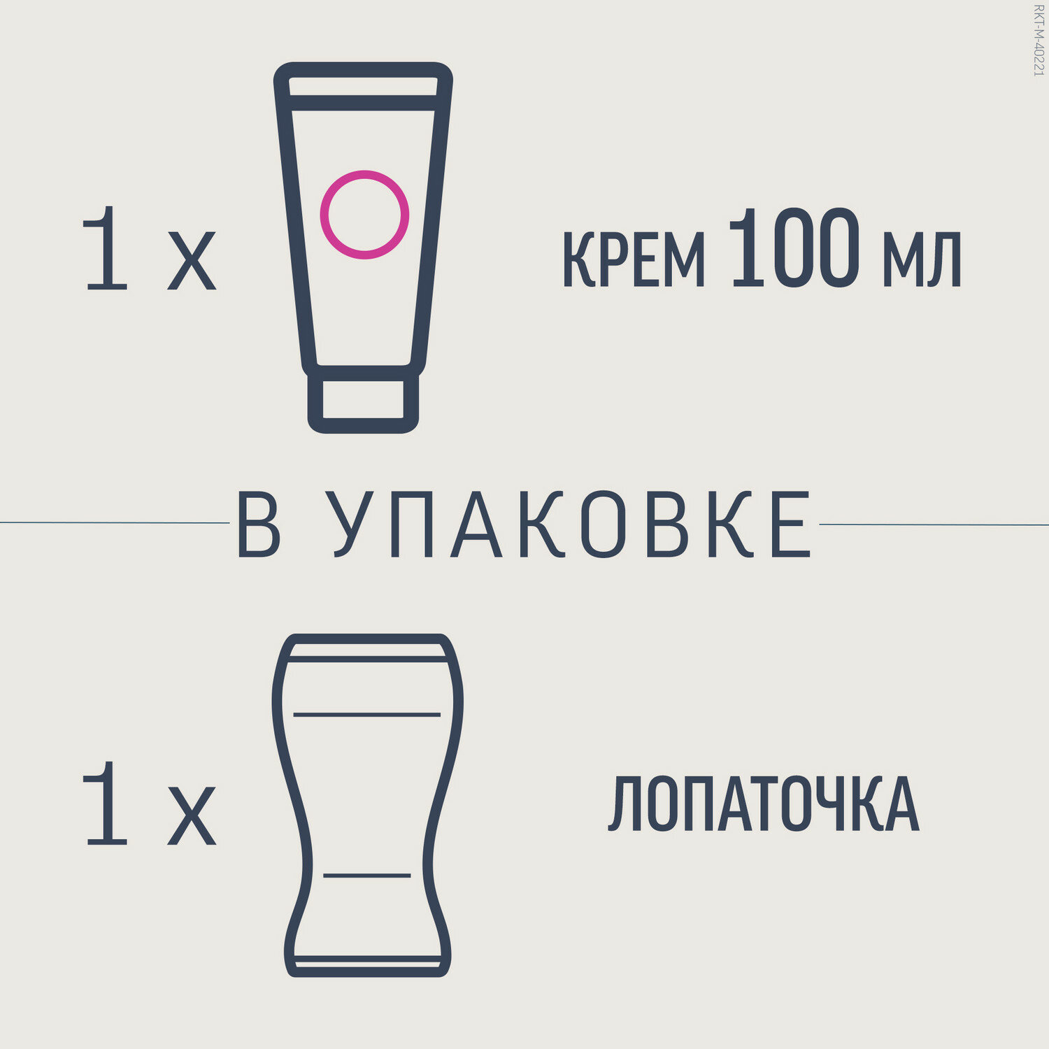 | Способ применения | нанесите крем на кожу и равномерно распределите его закругленной частью лопатки, чтобы он полностью покрыл волос. Оставьте крем на коже на 5 минут, а затем осторожно очистите небольшой участок лопаткой. Если волосы легко удаляются, широким или узким концом лопатки (в зависимости от части тела) уберите оставшийся крем. Если необходимо, оставьте крем на коже еще на несколько минут, но не более чем на 10 минут в целом. Тщательно промойте кожу водой после окончания процедуры и вытрите насухо |