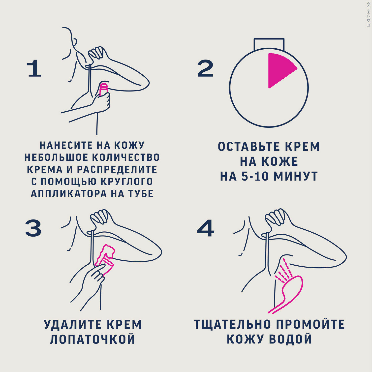 | Способ применения | снимите колпачок с тюбика, далее выдавите небольшое количество крема и распределите по коже с помощью специального аппликатора в виде купола. Не втирайте крем в кожу. Оставьте крем на коже на 5 минут, затем аккуратно очистите небольшую область лопаточкой. Если волосы легко удаляются, очистите кожу от крема с помощью лопаточки. Если необходимо, оставьте крем на коже еще на несколько минут, но не более 10 минут в общей сложности. По окончании процедуры тщательно промойте кожу водой и насухо вытрите |