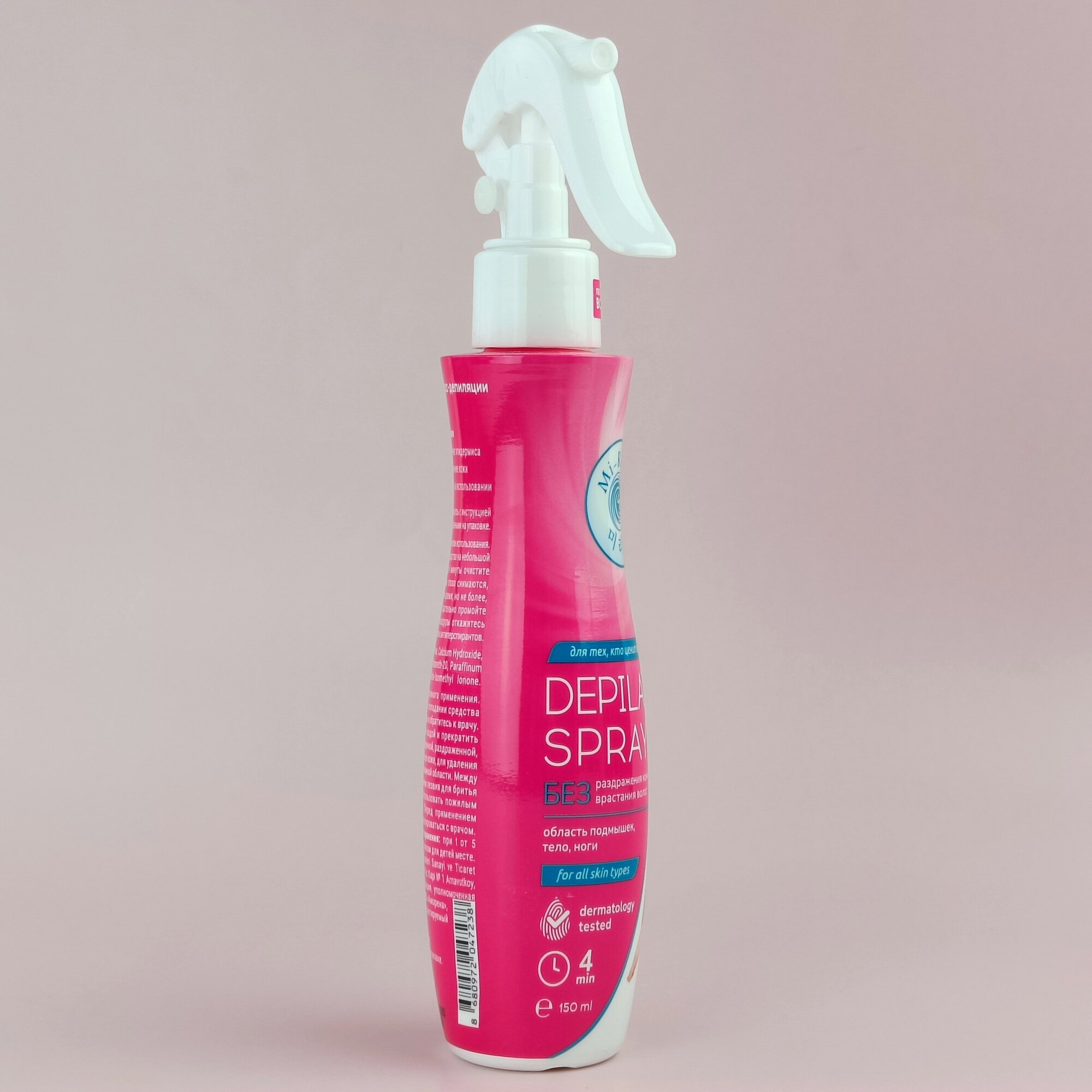 | Способ применения | Встряхните флакон перед началом использования. Кожа должна быть чистой и сухой. Распылите средство на небольшой участок кожи с расстояния 15-20 см. Через 4 минуты очистите водой и влажным полотенцем. Если волосы плохо снимаются, оставьте средство на коже еще на некоторое время, но не более, чем на 10 минут. По окончании процедуры тщательно промойте кожу водой. В течение 24 часов после процедуры откажитесь от использования в зоне депиляции дезодорантов и антиперспирантов. |