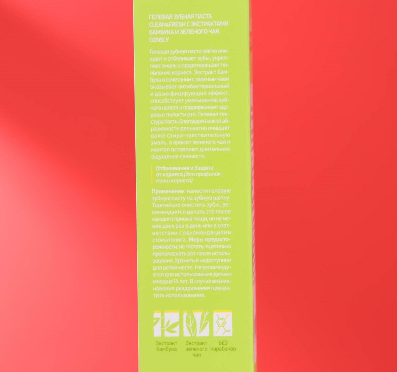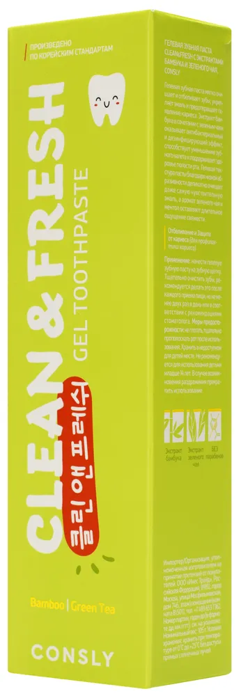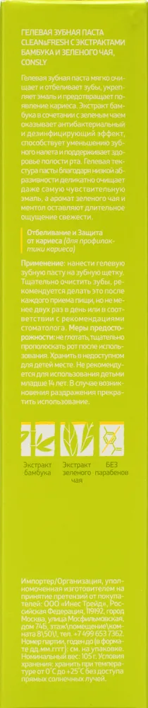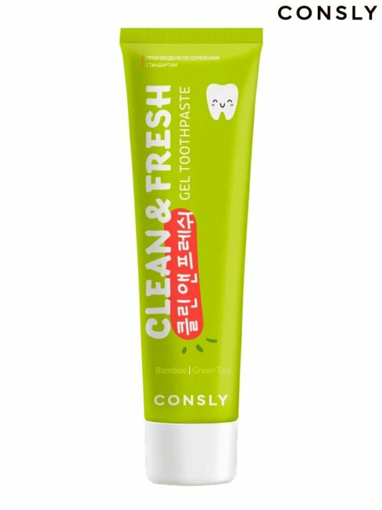 Consly Гелевая зубная паста Clean and Fresh с экстрактами бамбука и зеленого чая, 105г