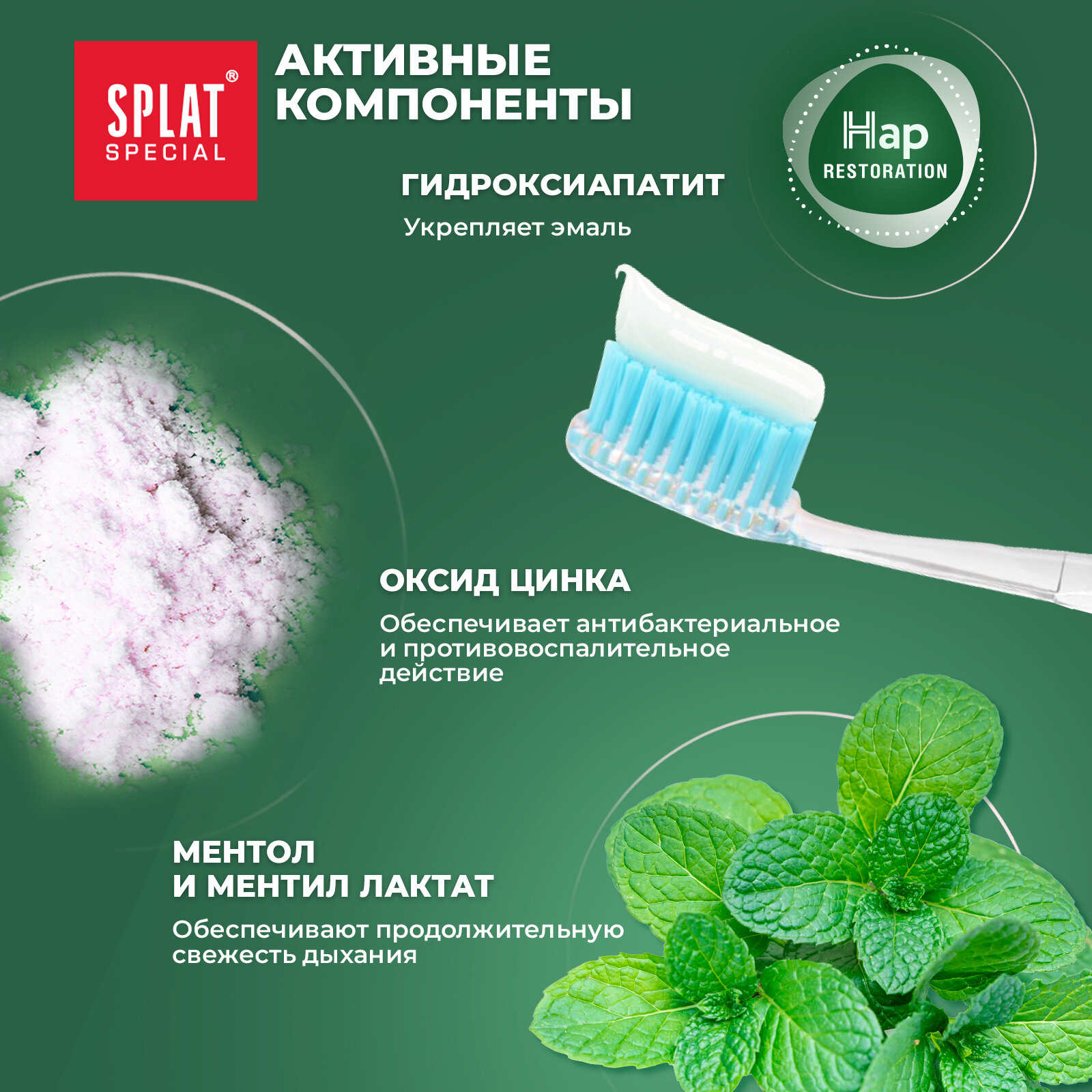 | Состав | Вода, Сорбитол, Диоксид Кремния, Глицерин, Дикальций Фосфат дигидрат, Гидроксиапатит кальция, Пирофосфат тетранатрия, Ароматизатор, Карбоксиметилцеллюлоза, Лауроил Саркозинат натрия, Бензиловый спирт, Глицерризинат Дикалия, Тетранатрия глутамат диацетат, Оксид цинка, Ментил Лактат, Шалфея экстракт, Экстракт граната, Экстракт грецкого ореха, Экстракт зеленого чая, Экстракт семян фенхеля, Экстракт листьев Стевии, Ментол, Папаин, Ретинил Пальмитат, Гидроксид Натрия, Линалол. |