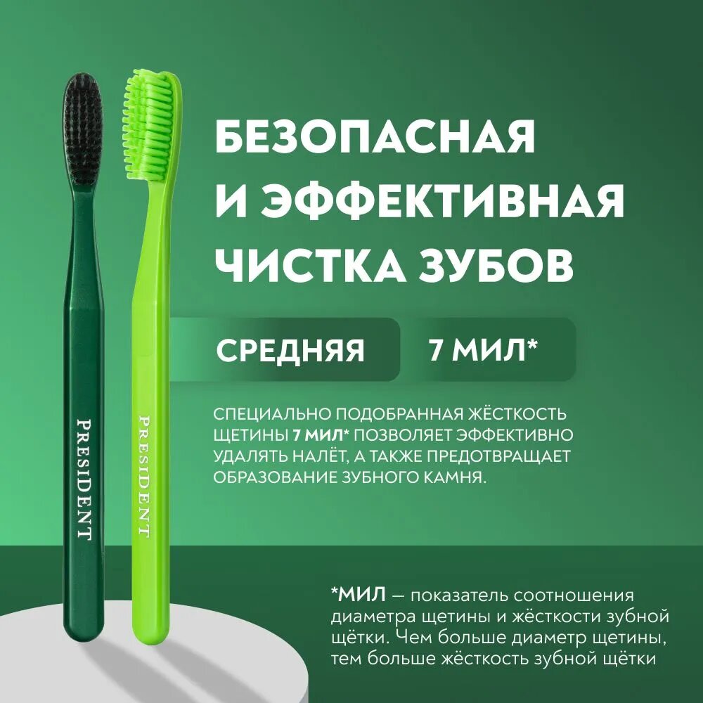 Зубная щетка средняя PRESIDENT Classic 7 МИЛ (зеленый/желтый), 2 штуки