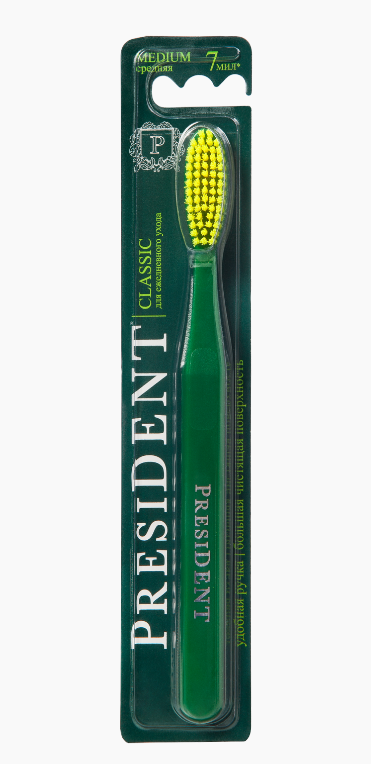 Зубная щетка средняя PRESIDENT Classic 7 МИЛ (зеленый/желтый), 2 штуки