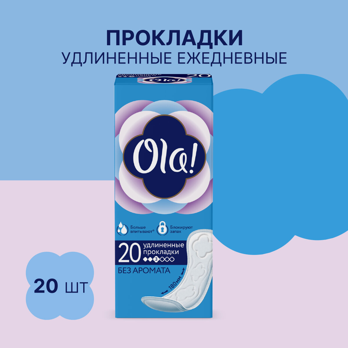 Прокладки женские ежедневные удлиненные Ola! без аромата, 60 шт. (3 уп. х 20), в коробе