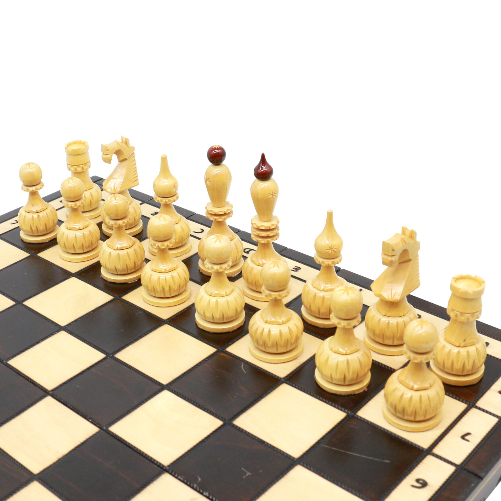 Шахматы из карельской березы с фигурами из янтаря 45х45 см