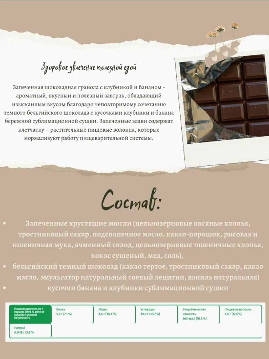 | Состав | запеченные хрустящие мюсли (цельнозерновые овсяные хлопья / тростниковый сахар / подсолнечное масло / кокос сушеный / пшеничная и рисовая мука / цельнозерновые пшеничные хлопья / какао-порошок / ячменный солод / мед / соль) / бельгийский темный шоколад (какао-тёртое / тросниковый сахар / какао-масло / эмульгатор натуральный соевый лецитин / ваниль натуральная) / кусочки банана и клубники сублимационной сушки |