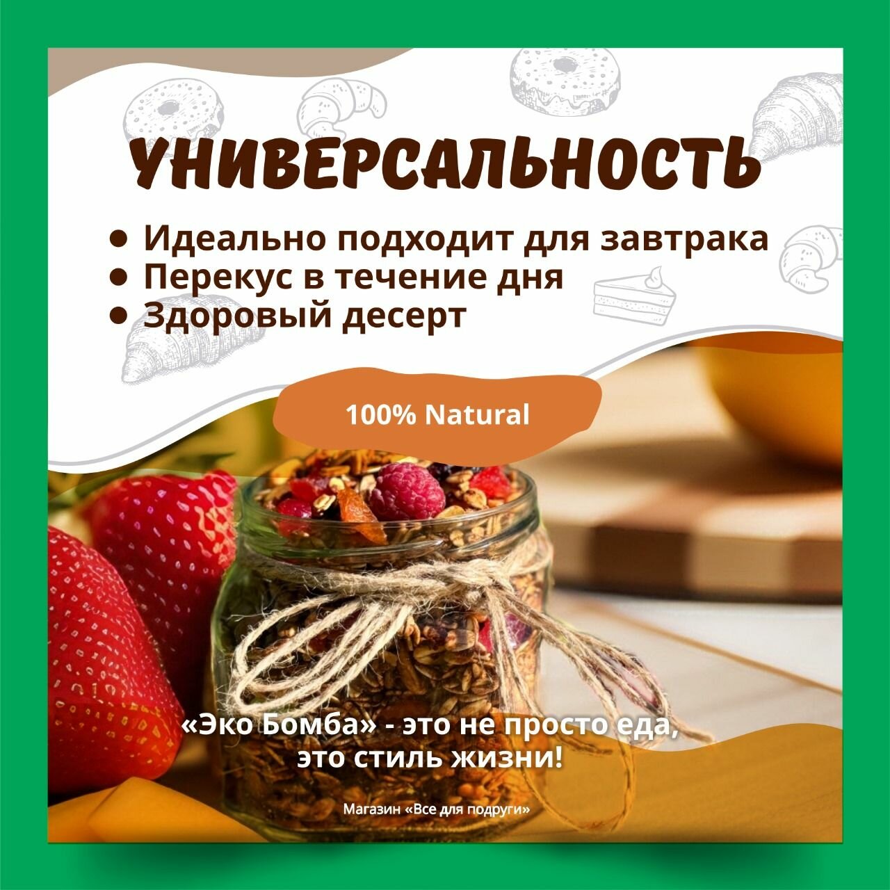 | Дополнительная информация | завтрак, мюсли, гранола, здоровое питание, диета, полезный, быстрый |