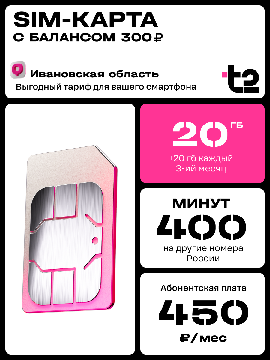 Купить Sim-карта t2 для Ивановской области, баланс 300 рублей