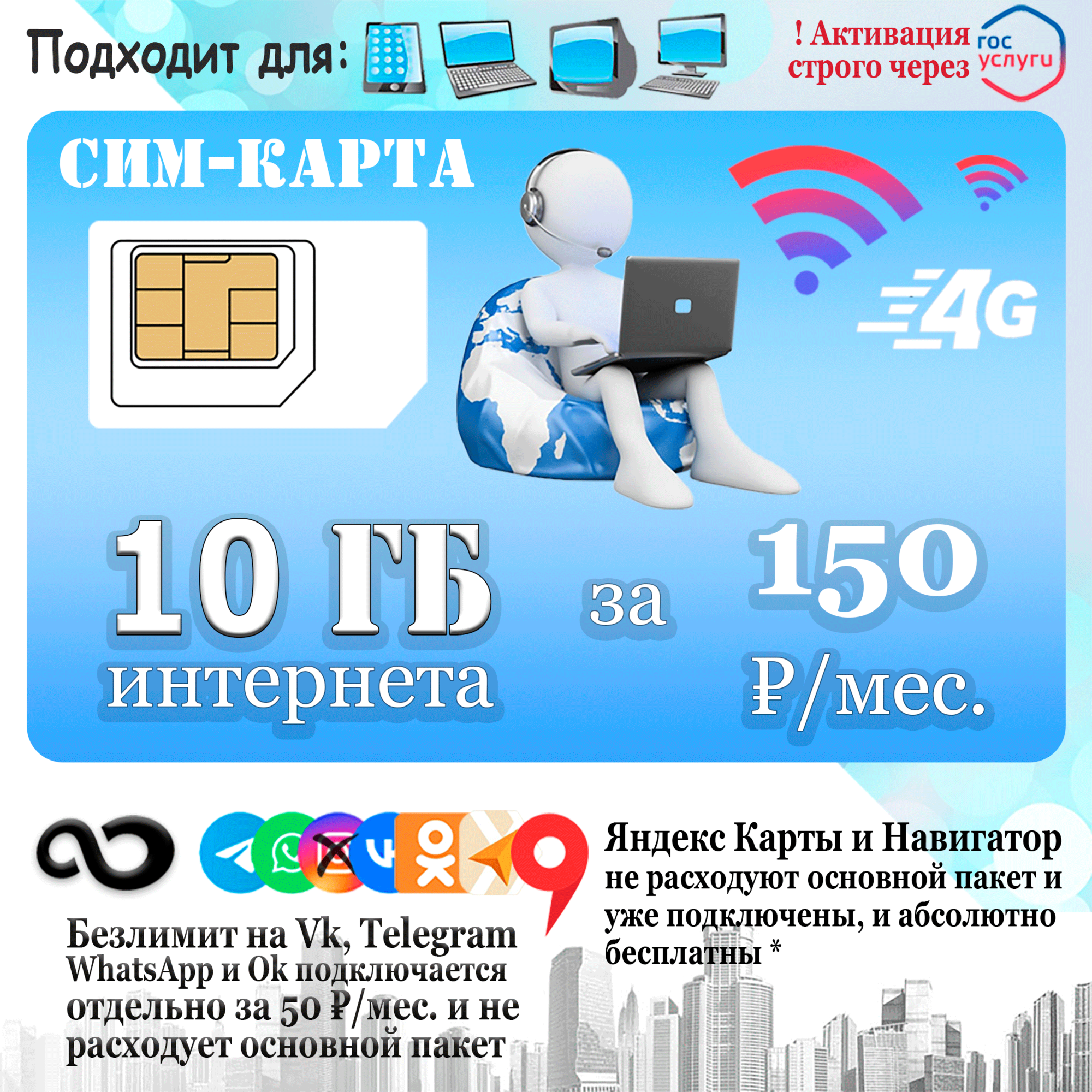SIM-карта Безлимит по РФ с Wi Fi, для всех устройств, 990 р / в месяц/ сим карта