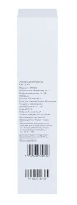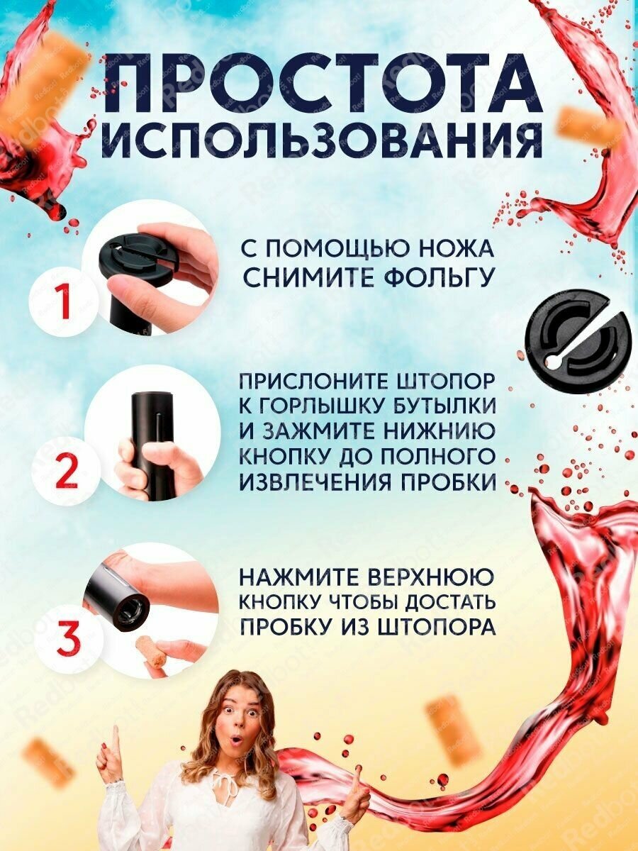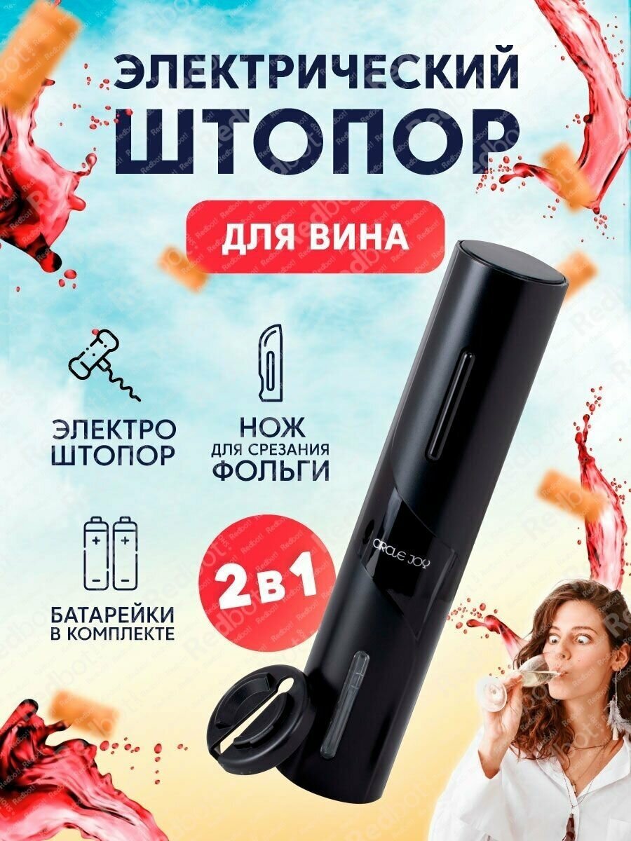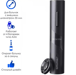 | Дополнительная информация | электрический штопор, вакуумная пробка, нож для снятия фольги с пробки, аэратор; штопор работает от четырех батареек типа АА |