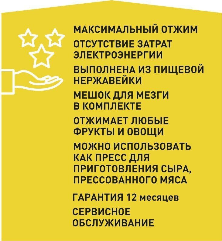 | Дополнительная информация | габариты: 360 x 295 x 460 мм; вес 10 кг; производительность сока в зависимости от сырья не более 15 л/час |