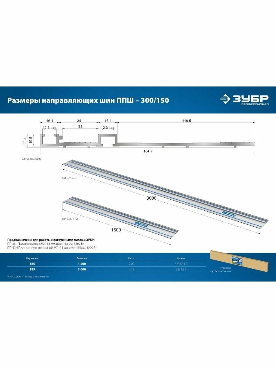 | Дополнительная информация | Преимущества направляющей шины ЗУБР 32332-1.5 Позволяет выполнять точные прямые резы. Противоскользящие ножки. Отверстия для максимально надежной фиксации. Противоскользящие ножки для дополнительной фиксации. Универсальная защита от сколов – резиновая направляющая (калибруется под инструмент при первом распиле). Противонаклонный упор предотвращает случайный сход инструмента с траектории (для инструмента, оснащенного зацепом под упор) |